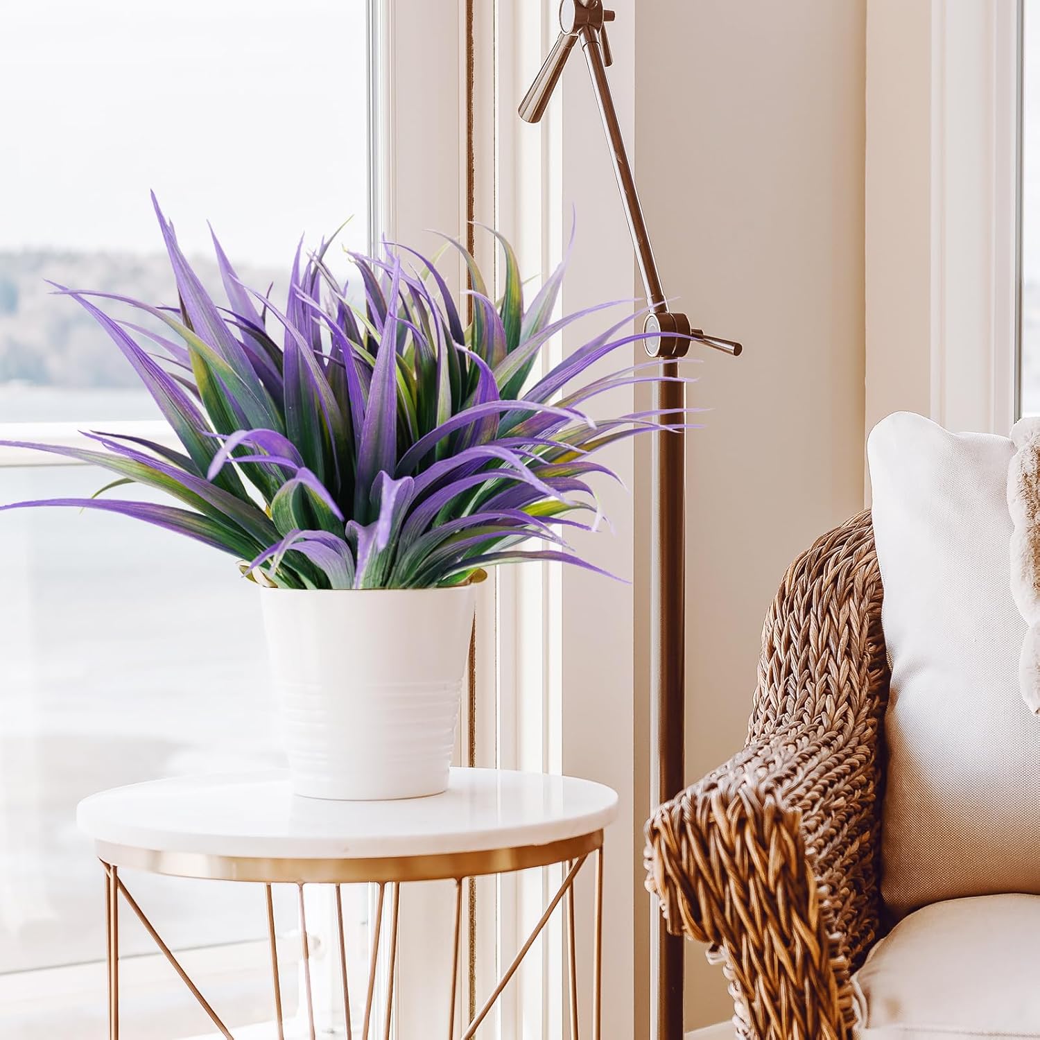 16Pcs Artificial Grass Fake Plants 17.3in Outdoor Plants UV Resistant Faux Greenery Stems Fake Grass for Home Window Garden Office Patio Pathway Front Porch Halloween Décor Green & Purple