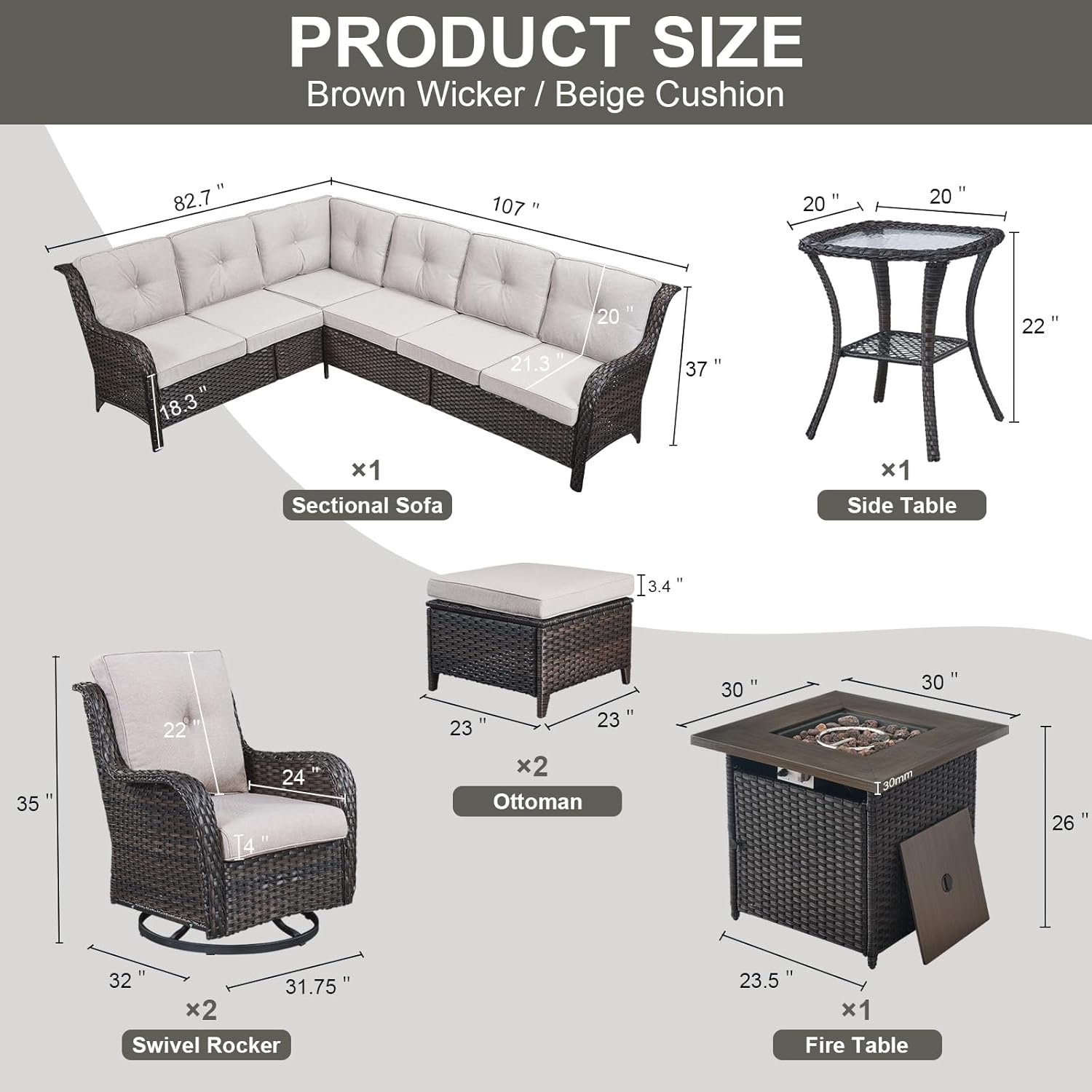 Outdoor Sectional Furniture Sofa Set with Propane Fire Pit Table, Wicker Patio Conversation Set with 2 Swivel Rocker Glider Chairs Beige Cushion Perfect for Backyard Casual Gathering