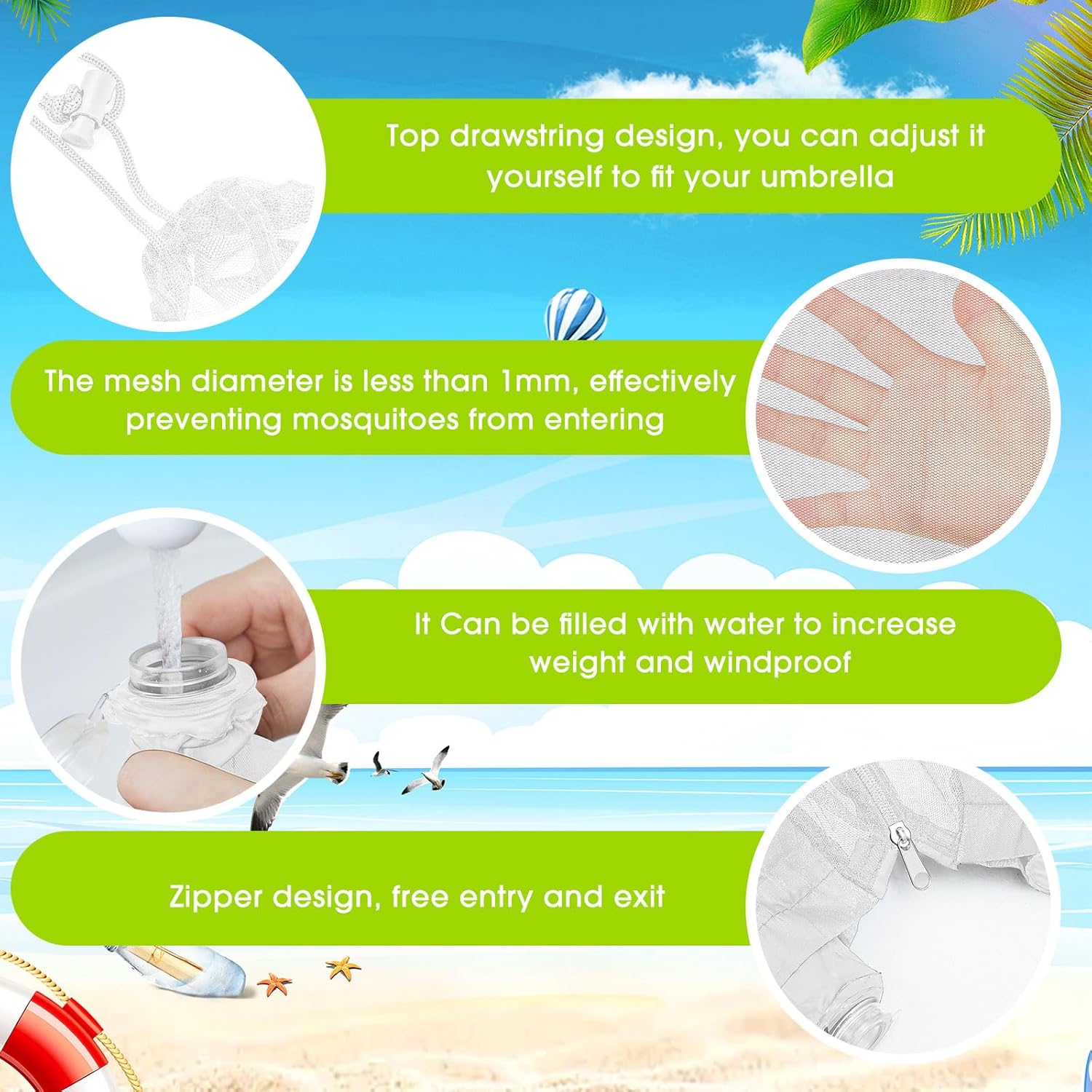 - Convenient to Carry: both sides of the mosquito netting for patio umbrella have zippers for easy access, 8 clips are included to help you secure the mosquito net to the umbrella when installing the umbrella screen, the umbrella net can be folded into a compact size for easy storage when not in use