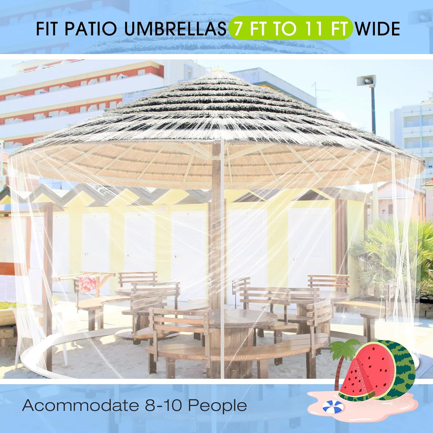 - Size Details: patio umbrellas netting measures about 9.8 x 7.5 ft/ 300 x 230 cm, 30.8 ft/ 940 cm in circumference, the top drawstring can easily adjust the patio umbrella mosquito nets, which can fit round table umbrellas with a diameter of 7 to 10 feet or square umbrellas with an 8 ft side, the maximum applicable height is up to 7.5 ft, they can also accommodate 7 to 9 people