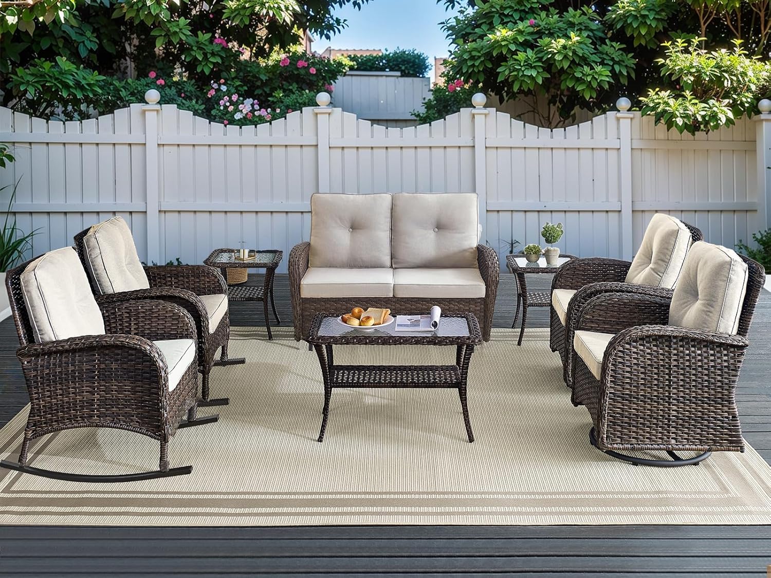 - Multi combination and function:This series of outdoor furniture set includes a variety of combinations, including functions such as swivel and glider chairs,rocking chairs,glider loveseat,suitable for a variety of scenarios,garden,balcony,deck,patio,porch,poolside,yard,corridors,sunrooms,etc.