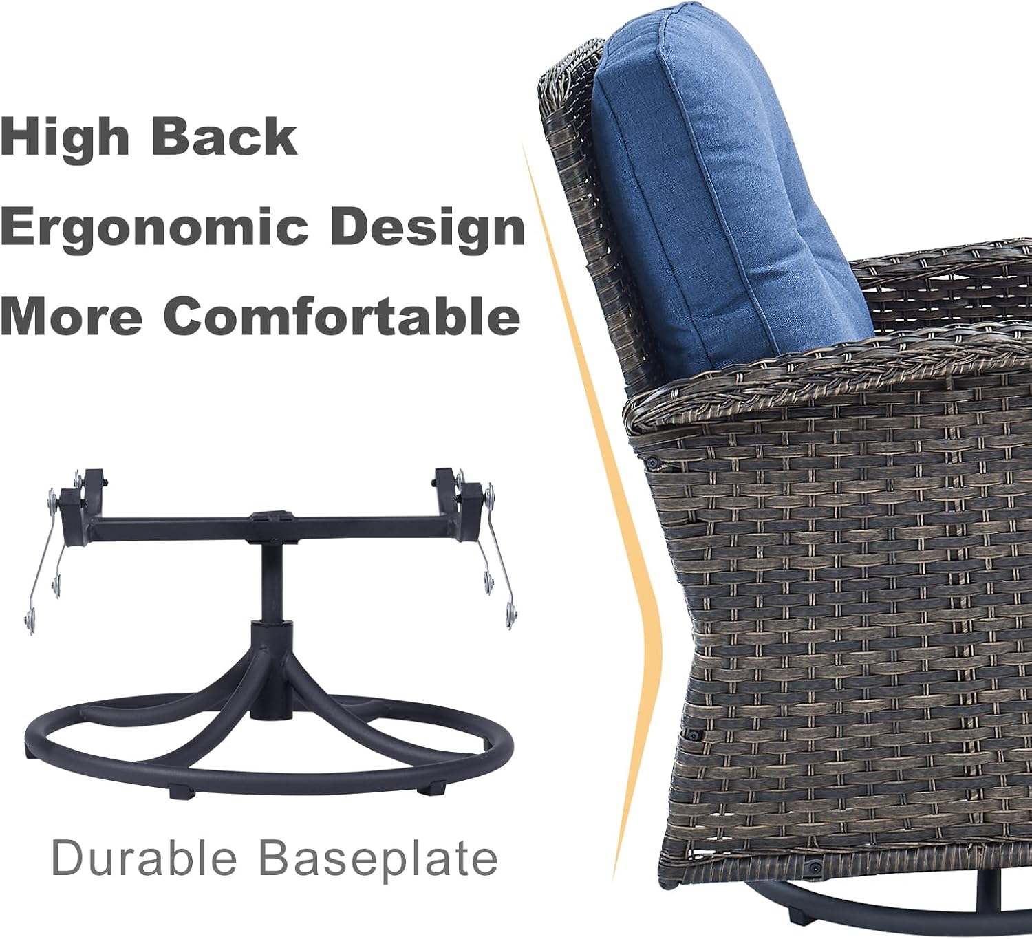 - Swivel Rocking Chairs:Resting on chairs with sturdy round metal base allows to glide gently and swivel 360Β° for relaxing, with seat and back cushions contribute to comfortable support, making the outdoor set a perfect addition to transform your patio.