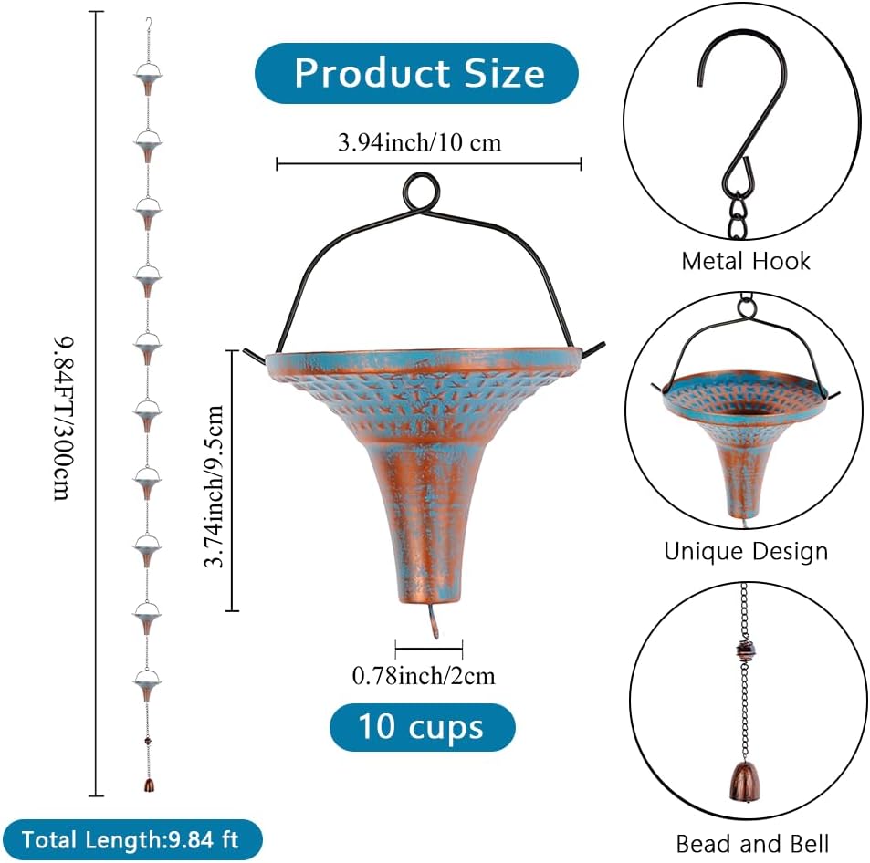 - Premium Material: The 10 feet rain gutter chain is made of excellent metal material, the surface of the rainchains with blue powder-coating, durable and rustproof. The rain catcher chain has a total of 10 blue funnel cups, each cup is 4 inch wide and 3.7 inch high