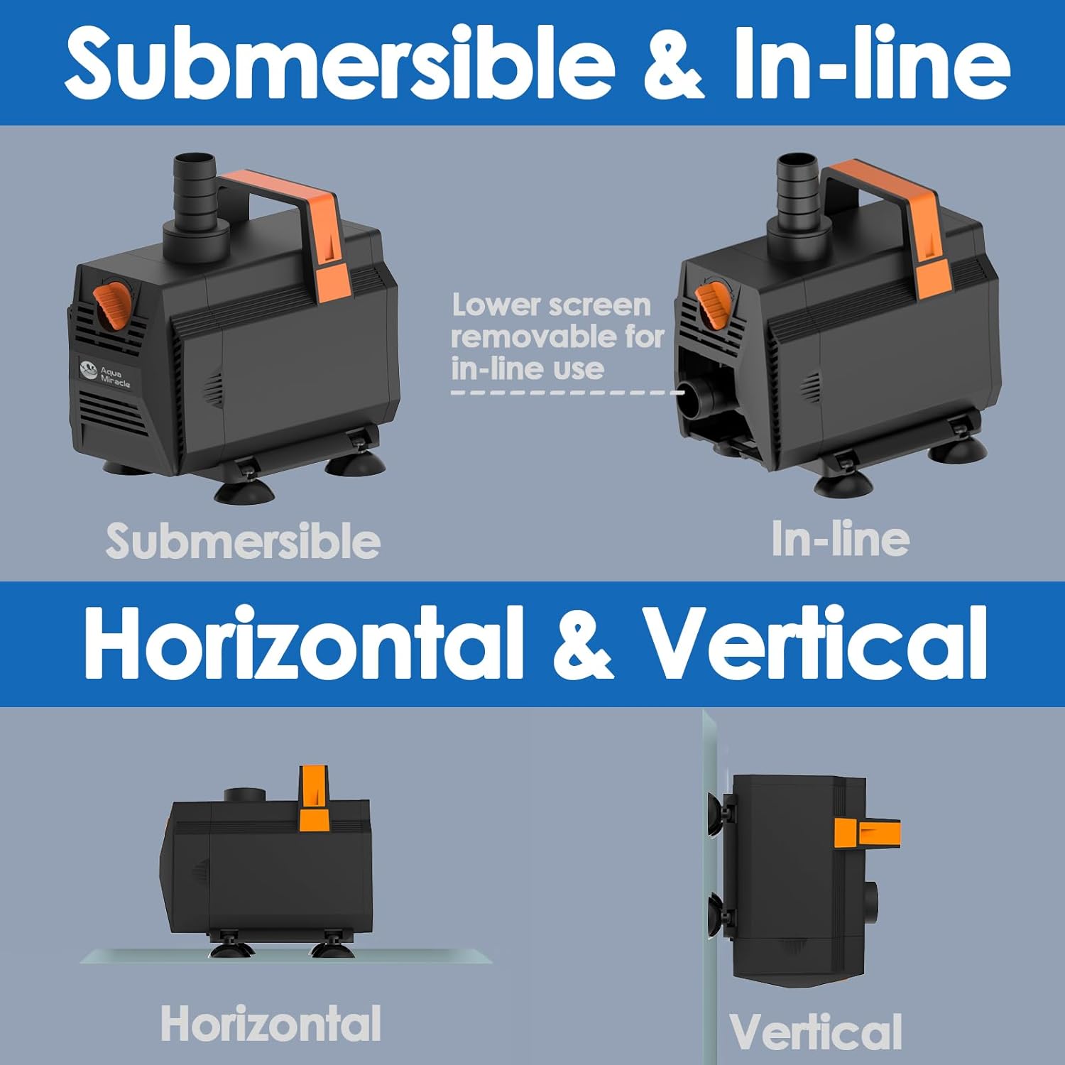 - VERSATILE USAGE - This pond pump is amphibious, suitable for both underwater and above-water applications. The removable front inlet screen facilitates easy connection to the inlet hose.