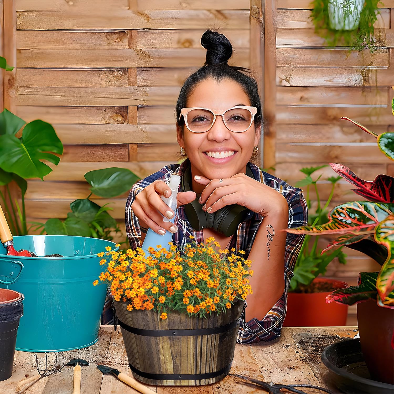 - 【Wide Application】Our wooden barrel planters set is a good choice for indoor and outdoor decor.Nice for home,decor,office, wedding, balcony,patio, garden, bedroom,vacation, other artificial plants and flowers.You can feel the quiet rural comfort when garden or front yard planting.
