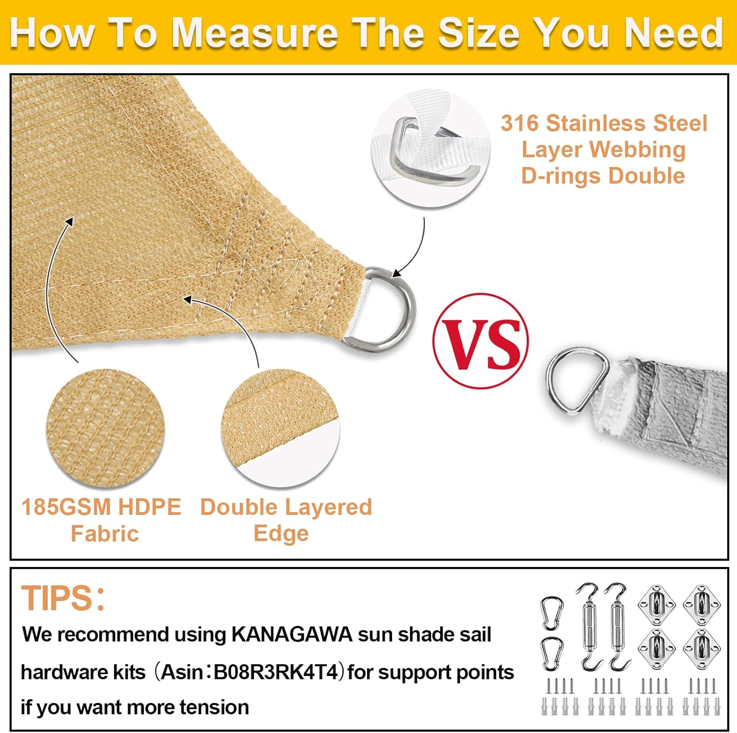 - High Quality Materials: Made of 100% brand new 185 GSM HDPE (high density polyethylene) material.Our sunshade sail is attached with DOUBLE layer webbing in each side and stainless steel D rings in corners to make the sun sail shades stronger and more durable