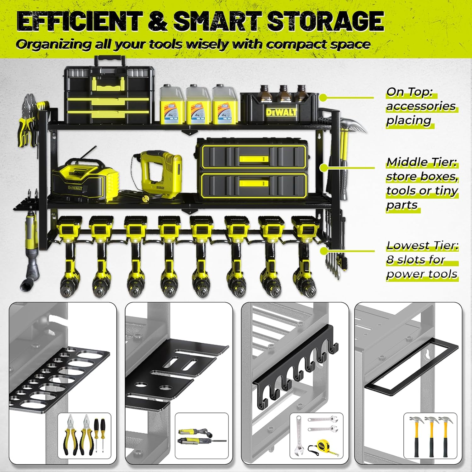 - High Capacity: Wall-mounted power tool holder with ample space - the upper two tiers accommodate various power tool accessories, while the bottom tier features eight universal power tool slots. KAFAHOM always thinks about better storage.