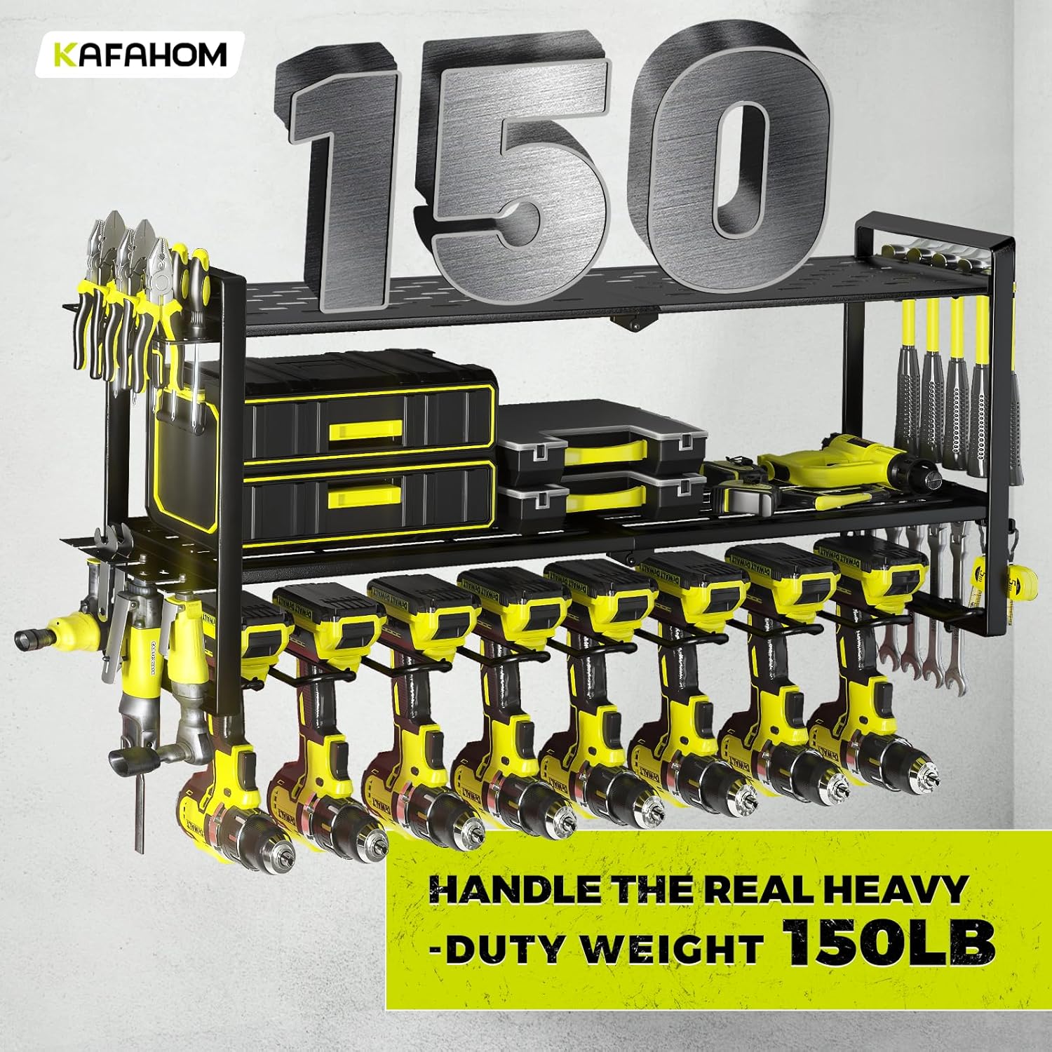 - Sturdy Construction: KAFAHOM power tools rack is built the 3 tiers with durability and stability in mind. The top tier is constructed with an iron plate for superior load-bearing capabilities, supporting up to 150 lbs.