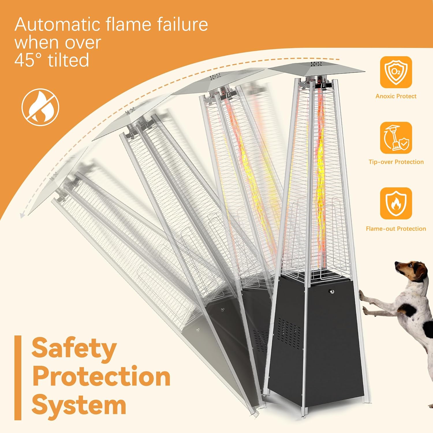 - 【Multiple Safety Protection】To avoid dangers of strong winds or accidental collisions, our pyramid patio heater has an auto-shutoff function that will automatically turn its flame off if the device is tilted more than 45 degrees. It also has an explosion-proof pipe and protective nets, ensuring you can use the outdoor heater with confidence. Additionally, each product has gone through 10,000 automatic flame-out tests before leaving the factory, so you don’t need to worry about safety issues.