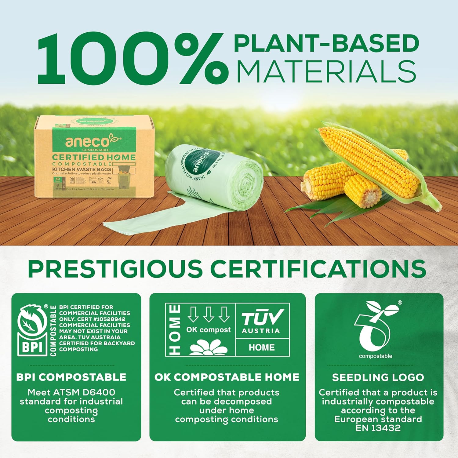 - ๐ ๐๐ฎ๐ฌ๐ญ๐๐ข๐ง๐๐๐ฅ๐ & ๐๐๐ญ๐ฎ๐ซ๐๐ฅ๐ฅ๐ฒ: Made from renewable resources like corn starch and plant-based materials, ANECO 8 gallon garbage bags decompose naturally into CO2, water, and biomass within a year, leaving no harmful traces. Prestigious certifications from BPI Compostable (US standard ASTM D6400), TUV Austria (OK Compost Home), and European Bioplastics (Seedling Logo) guarantee their eco-friendliness.