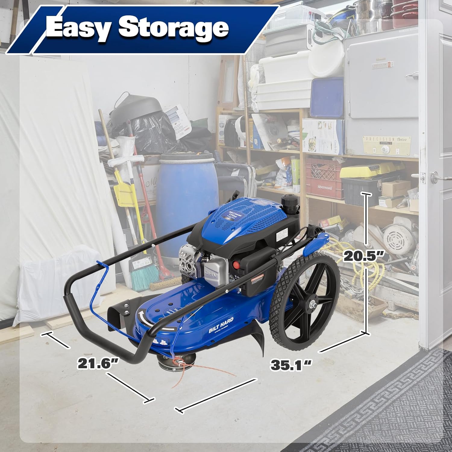 - EASY MANEUVERING: Equipped with 14-inch never-flat wheels, this gas-powered string trimmer can tackle all terrains and go wherever you need it to. The foldable ergonomic handle provides an improved grip and allows for compact storage.