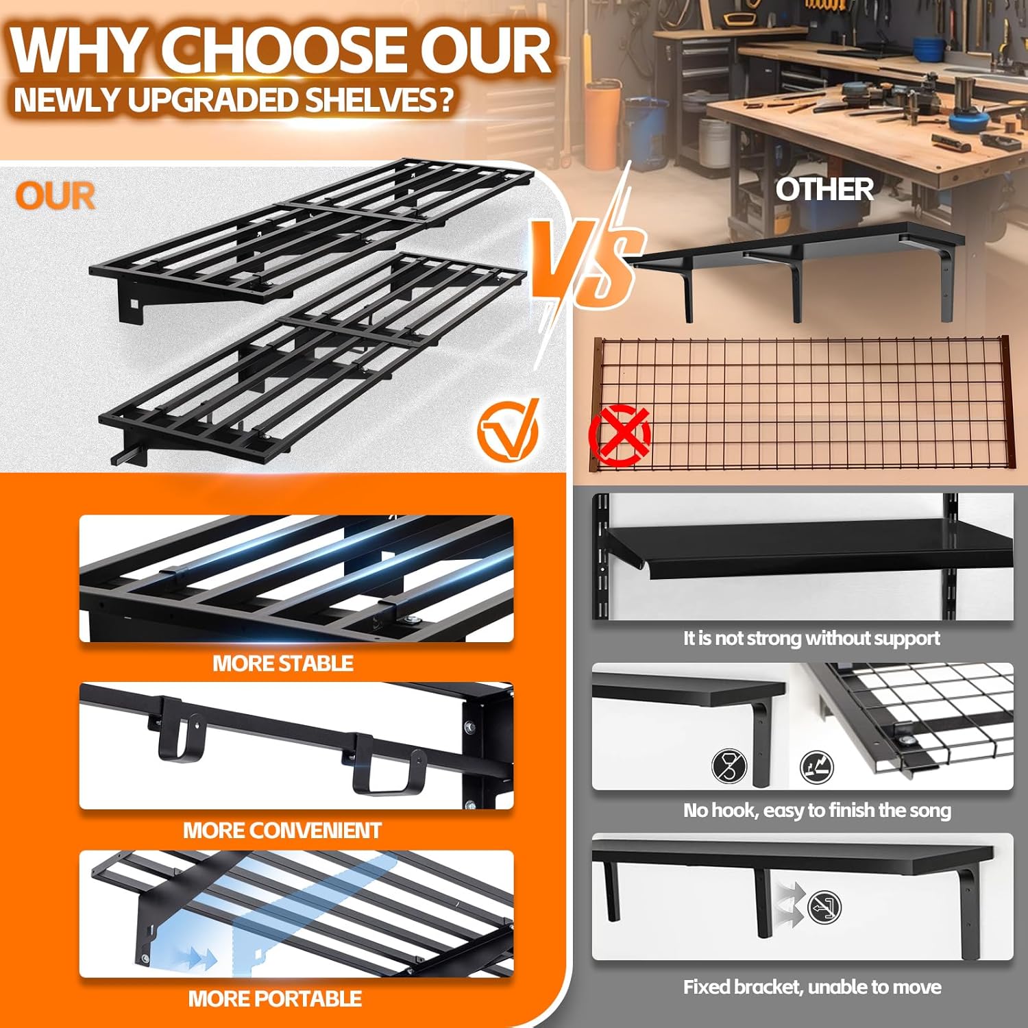 - More Sturdy and Stable: All accessories of garage shelving heavy duty have undergone strict quality inspection; Multiple load tests are conducted; Garage shelf wall mount design uses large flat-head internal hex screws to firmly secure the garage shelving wall mounted; The content is fixed in two places on the bracket with screws and fasteners,preventing the shelf from sliding or falling off