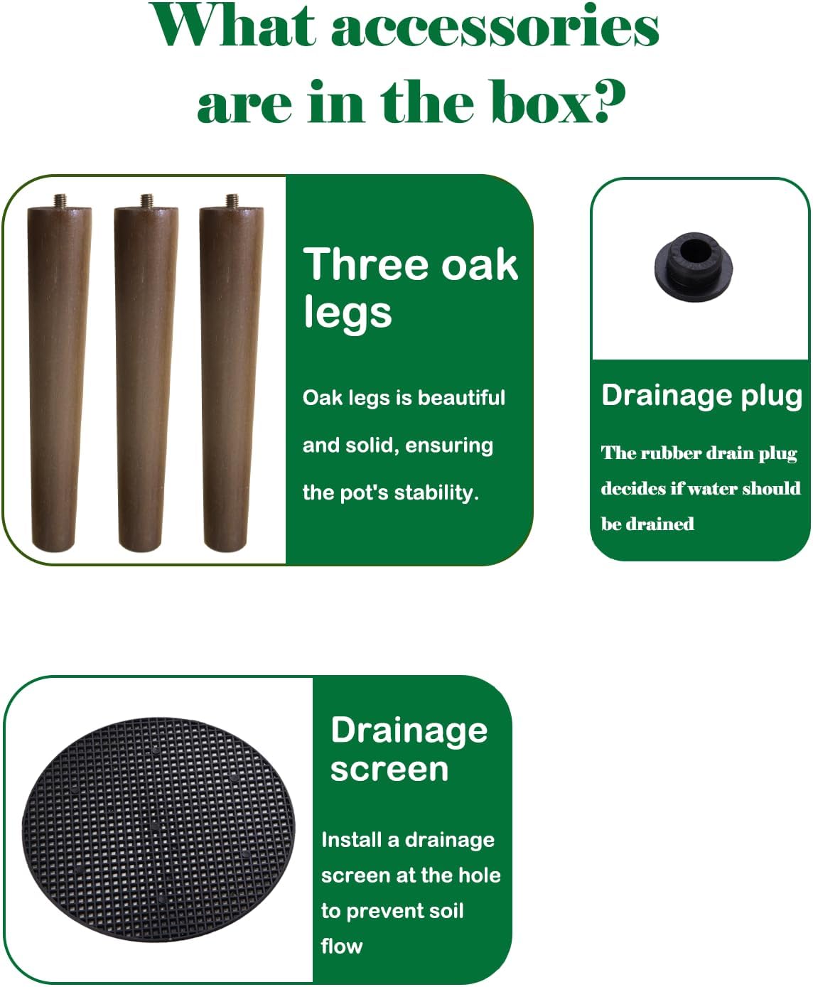 - Wooden leg flower pot: Three high-quality oak legs are very easy to install, just screw the wooden legs into the holes, no tools are required to complete.The triangular structure is more stable and can withstand up to 100 pounds.