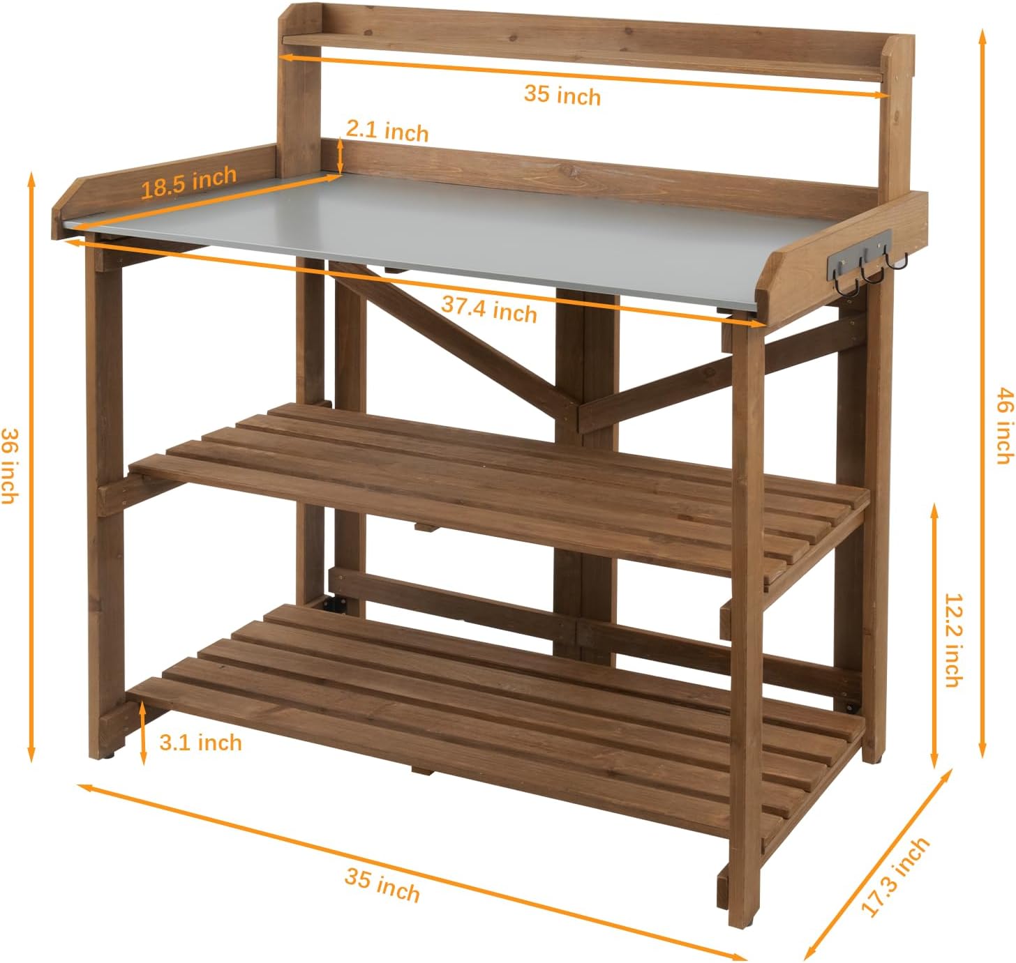 - 【Thoughtful Design】The top shelf of the flower pot bench can house your planted flowers and tools. The raised tabletop edges can prevent the falling of items on the top. 3 side hooks are perfect for keeping your favorite trowel, trencher or other tools in arm's reach.The 2-tiers bottom shelves are perfect for you to place soil and other large supplies.