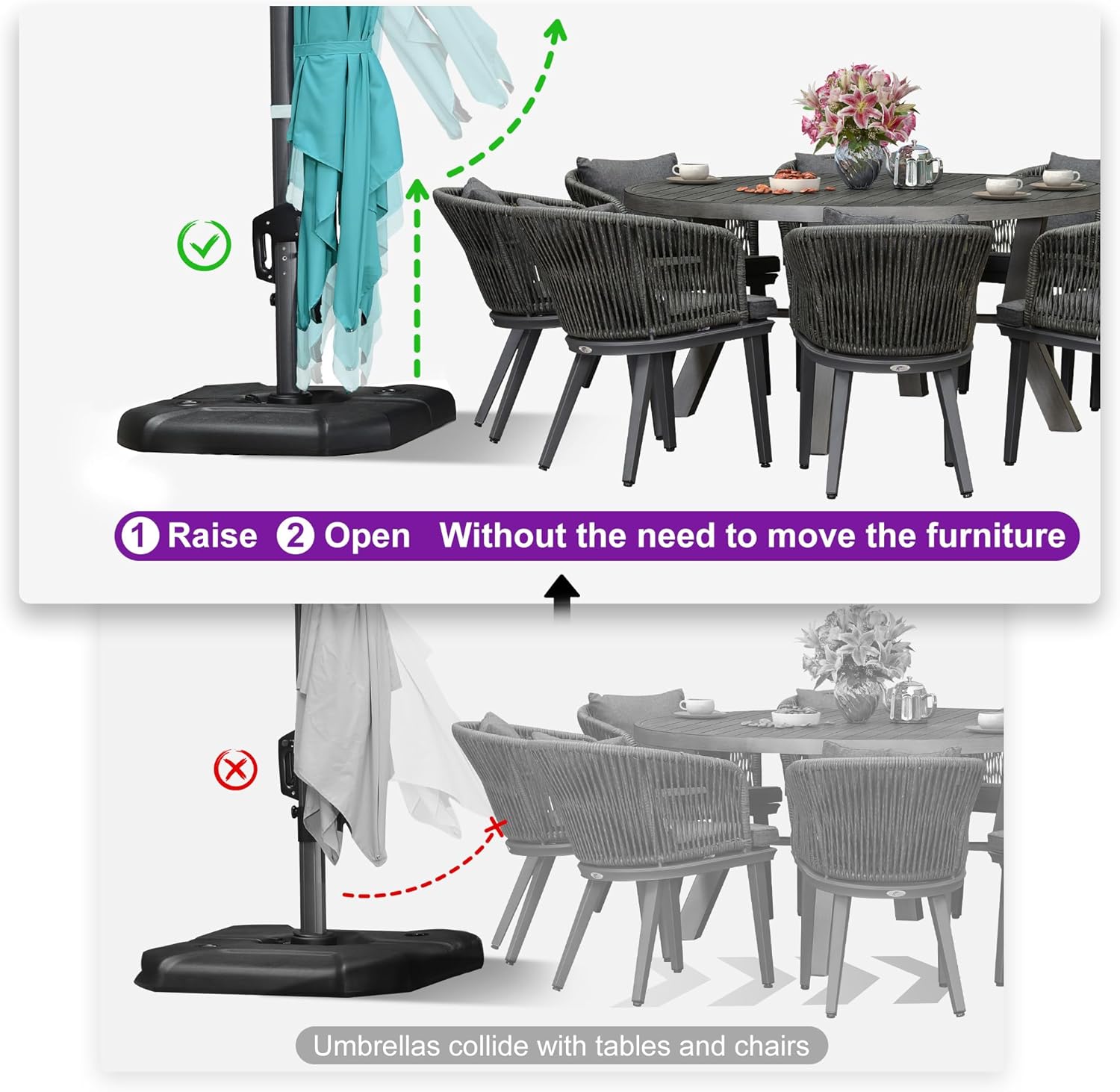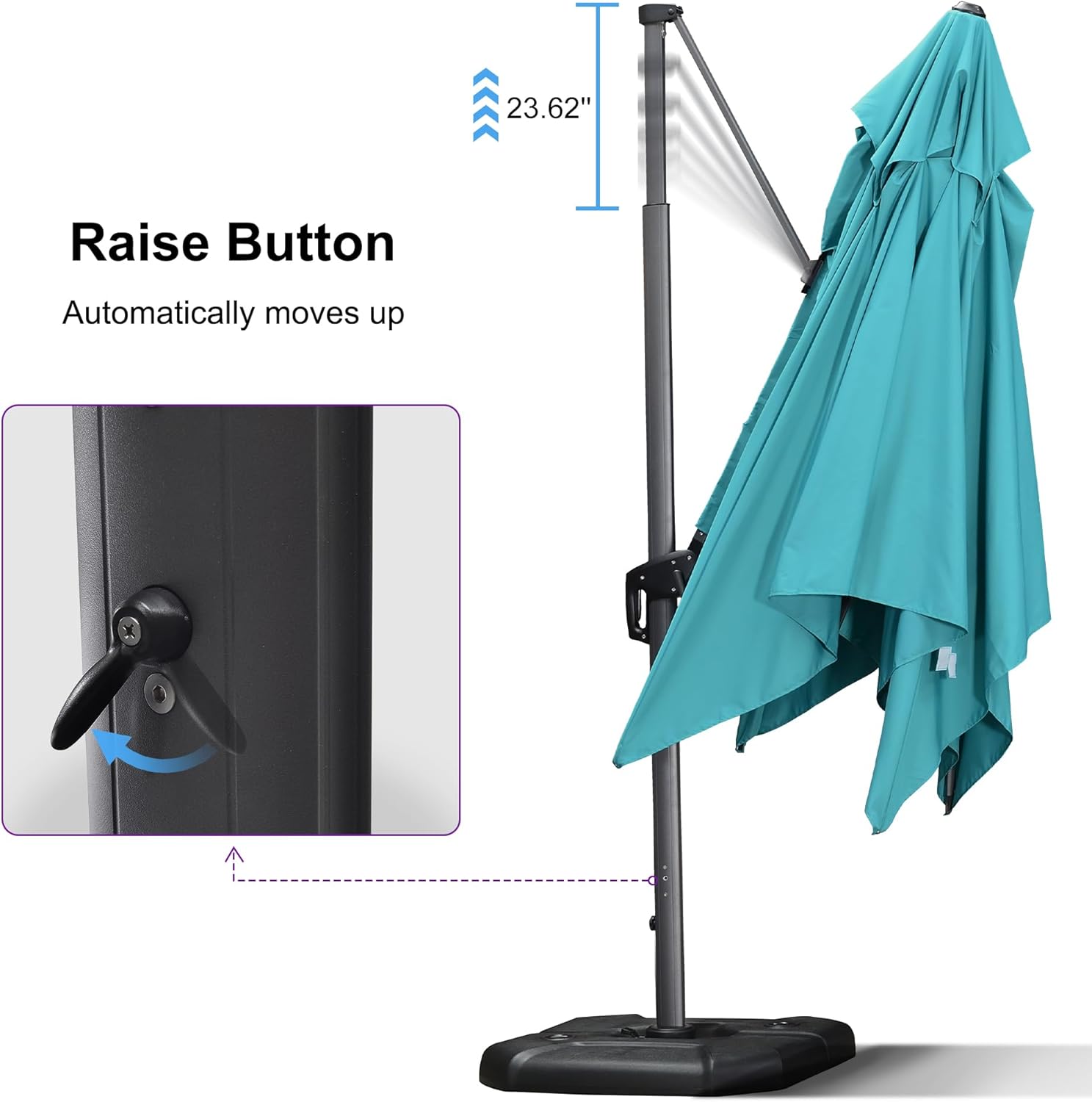 - Five-level Adjustment & 360Β° Rotation: The crank system of this cantilever umbrella makes it easy to raise and lower the canopy, the unique handle design also makes tilting the patio umbrella effortless, foot pedal allows for complete 360 degree rotation