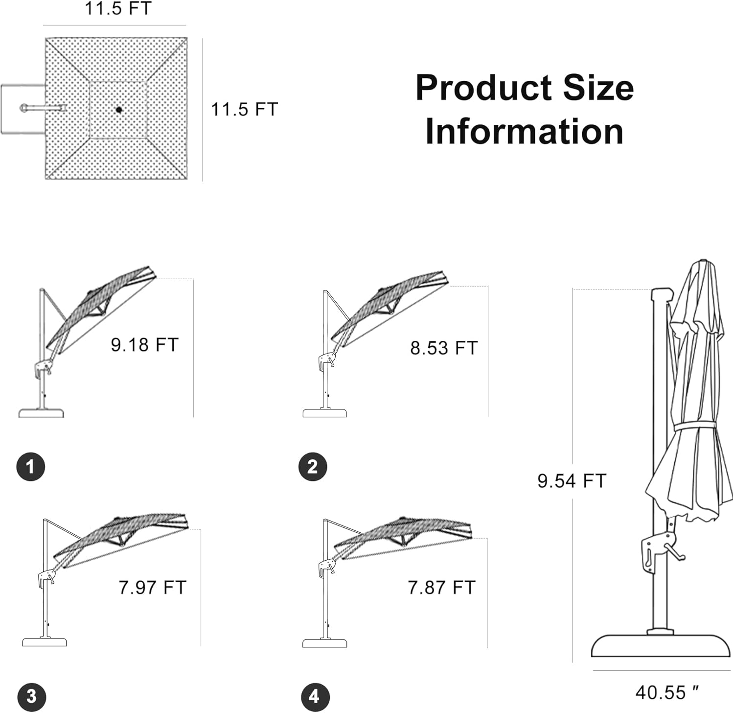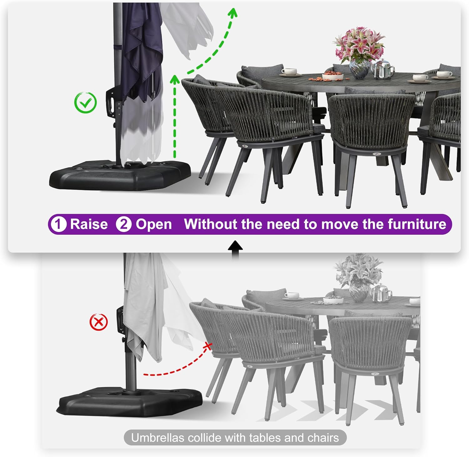 - Five-level Adjustment & 360Β° Rotation: The crank system of this cantilever umbrella makes it easy to raise and lower the canopy, the unique handle design also makes tilting the patio umbrella effortless, foot pedal allows for complete 360 degree rotation