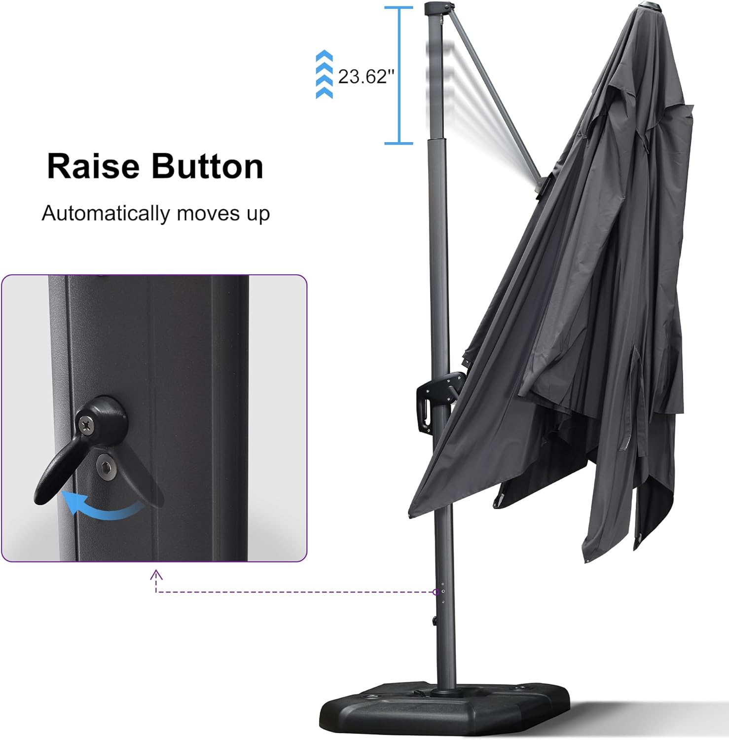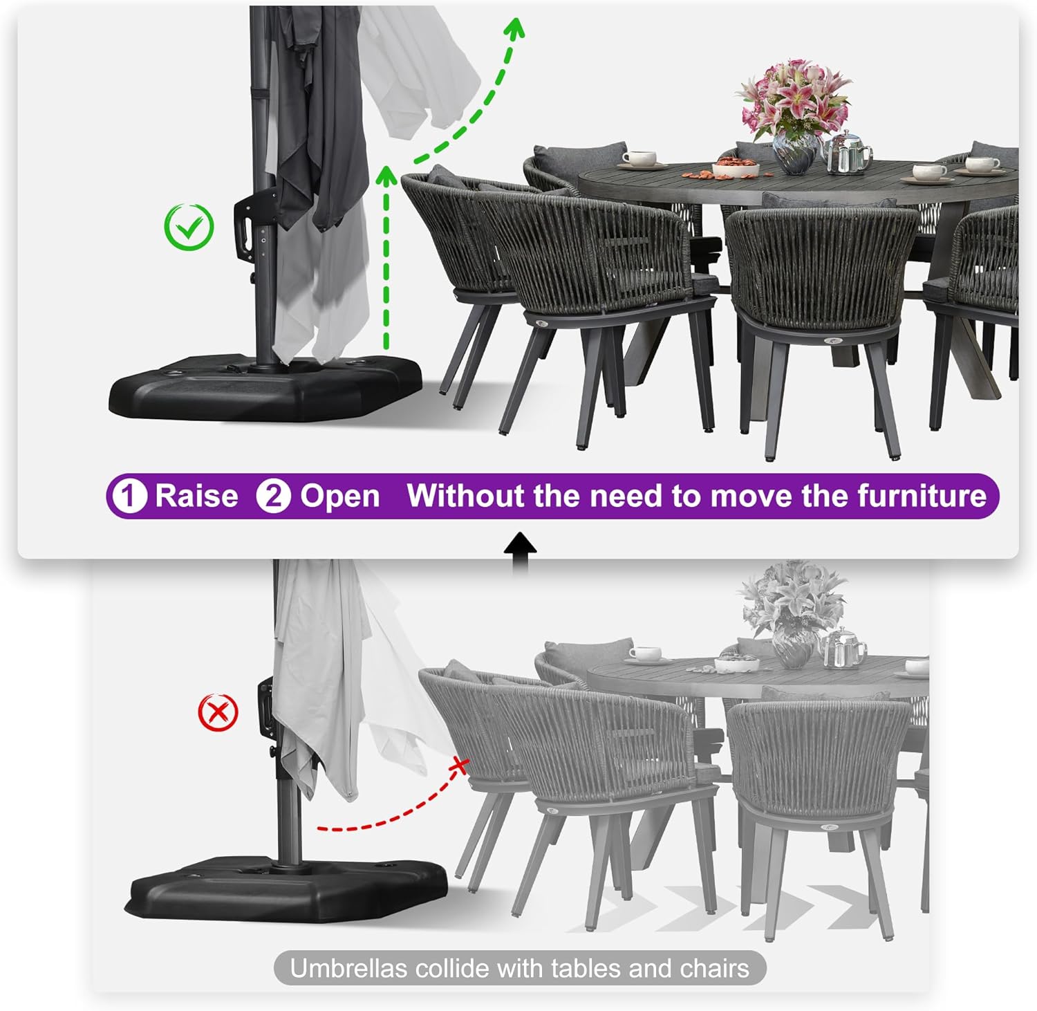 - Five-level Adjustment & 360Β° Rotation: The crank system of this cantilever umbrella makes it easy to raise and lower the canopy, the unique handle design also makes tilting the patio umbrella effortless, foot pedal allows for complete 360 degree rotation