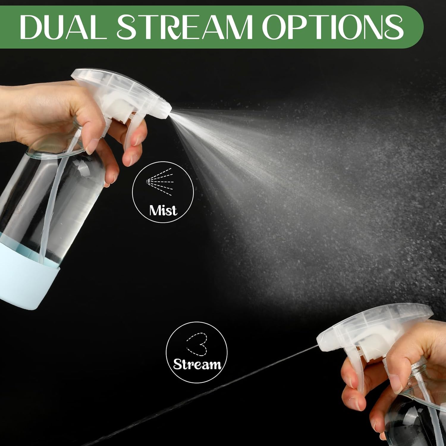 - Adjustable Dual Cap Nozzle: Upgraded nozzles x 7, tested to spray more than 70,000 times without crack, we are equipped with three settings: mist, stream, or off option, each spray bottle can pump liquid uniformly for the best coverage area and reach