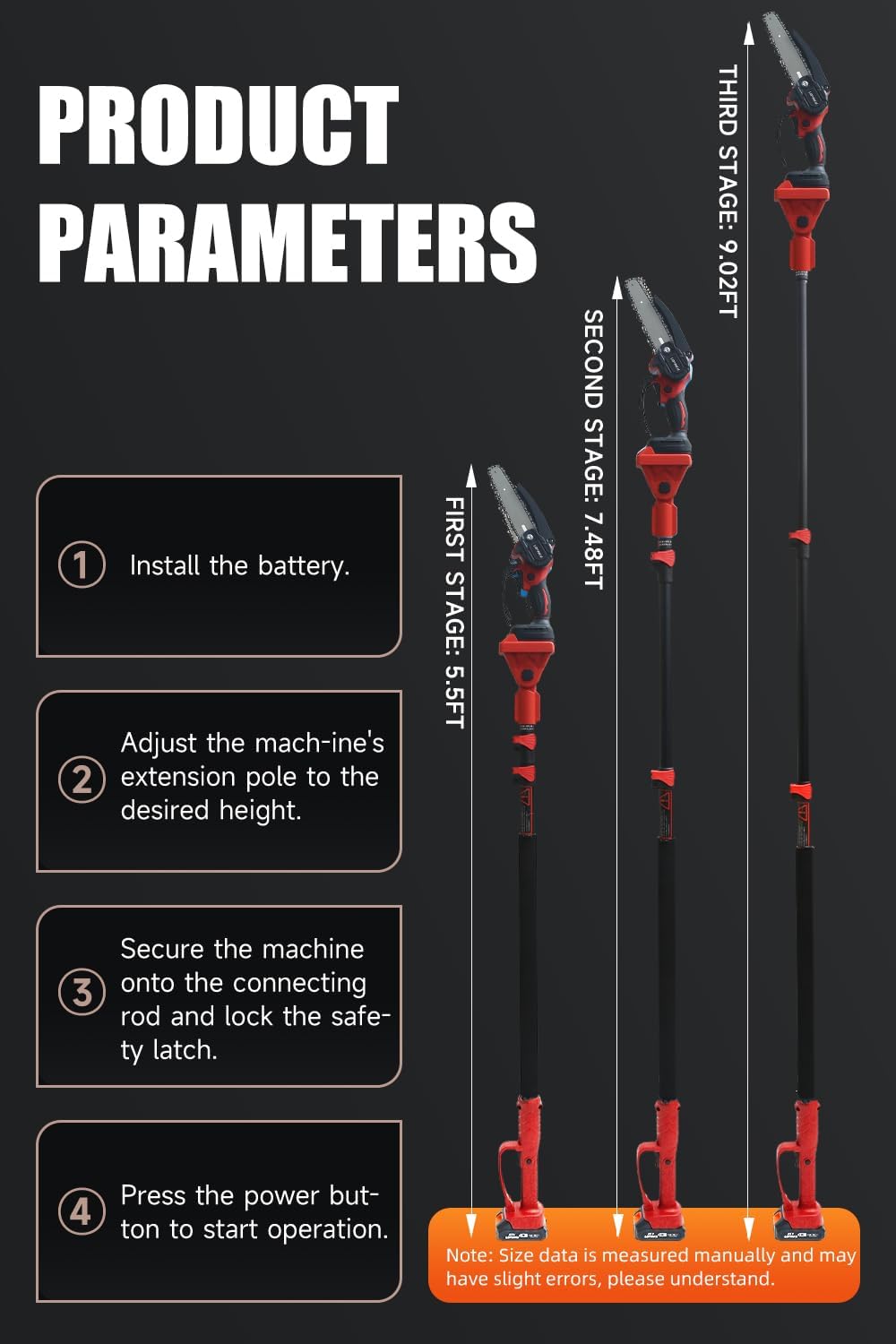 - 【Multiple Safety Features Prioritized in the Electric Pruner Kit】 The Electric Pruner Kit features a dual-locking system to prevent accidental operation.Additionally, the extension pole is equipped with a safety device to prevent unexpected detachment—simply secure the rivet to the bottom of the electric chainsaw or pruner to prevent accidental disengagement.