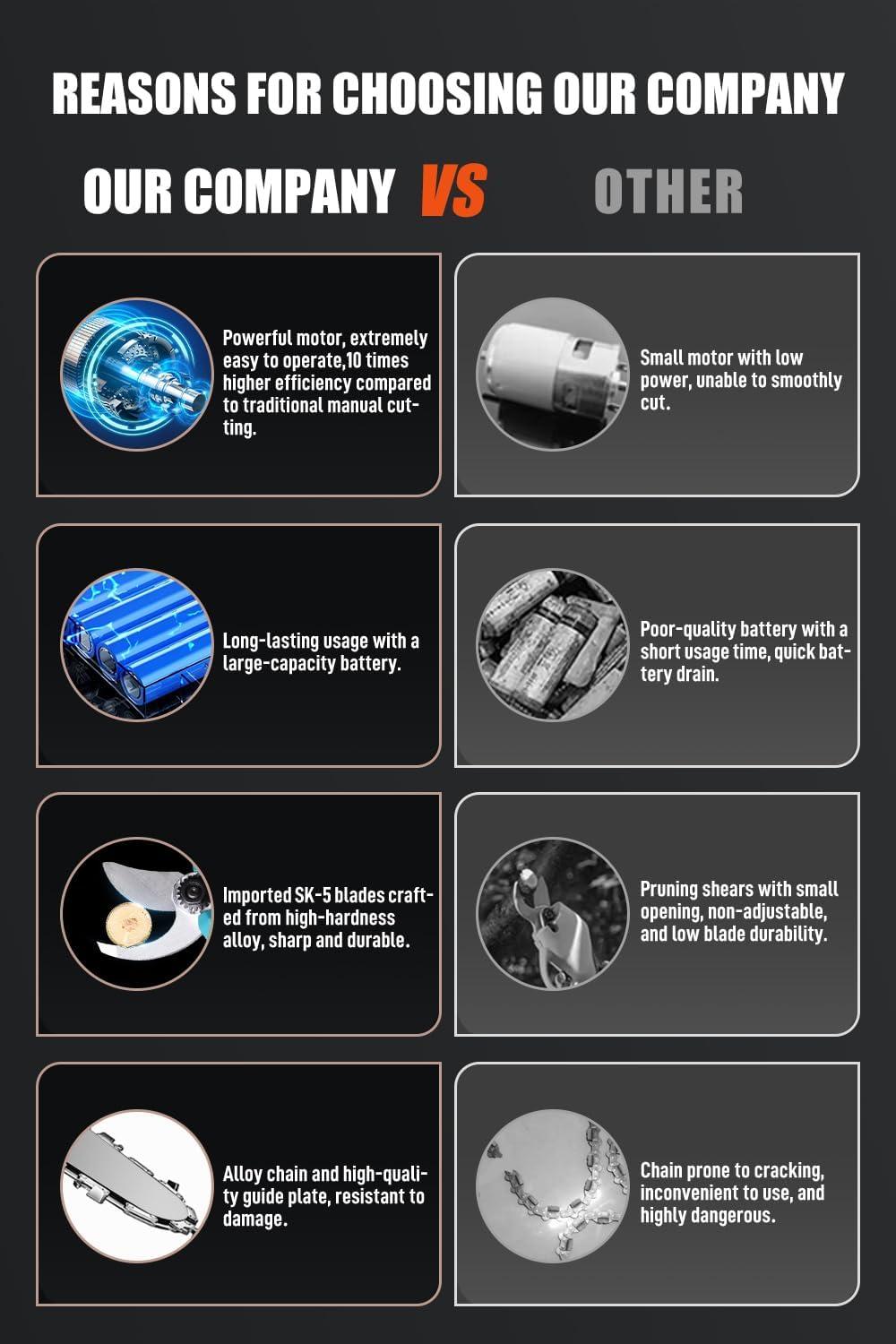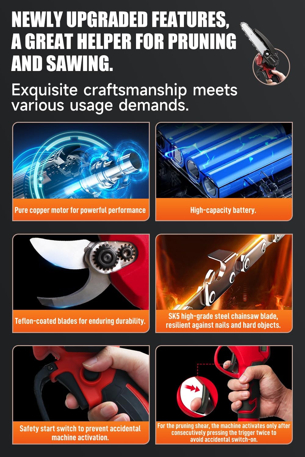 - 【Employing High-Quality Pure Copper Motor for Exceptional Cutting Efficiency in the Electric Pruner Kit】 The combination of a brushed motor with a sharp, high-hardness chain in the Electric Pruner Kit achieves outstanding cutting efficiency. The pruning shears within the Electric Pruner Kit are equipped with a brushless motor to ensure stable motor operation.