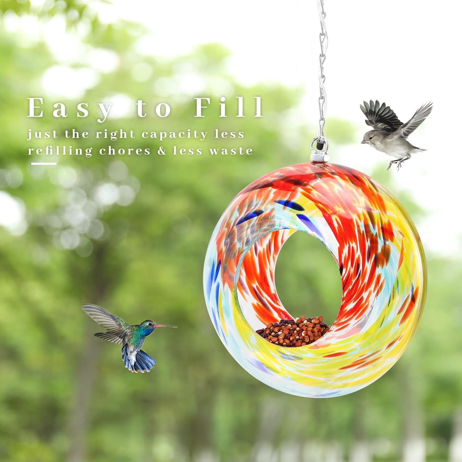 - 【Fly Through Bird Feeder】Features a fly-through design that allows birds to easily access seed. After they're done eating, they can fly away with ease as well. It's fun to watch them eat and fly back and forth to the feeder