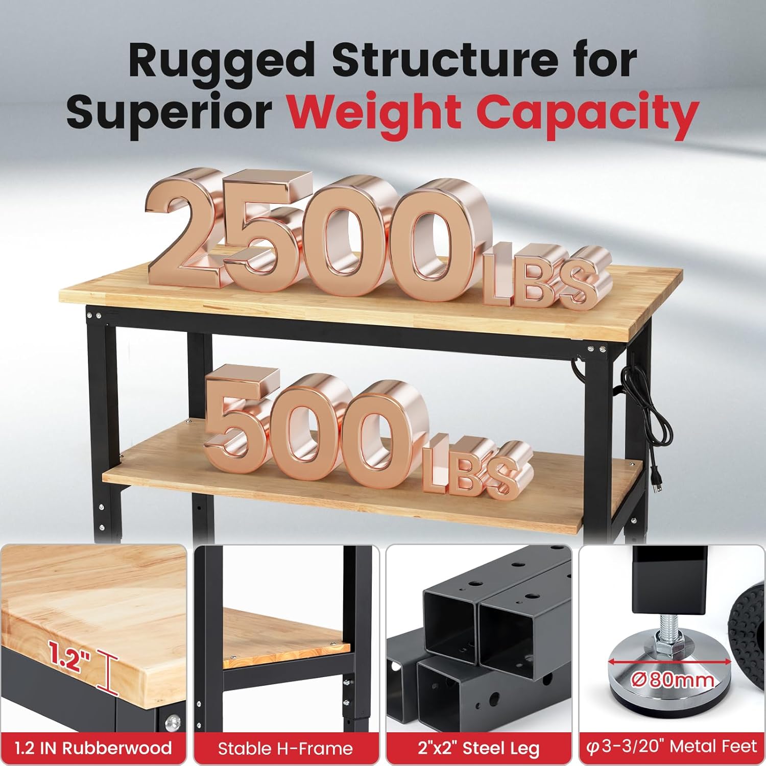 48 Inch Work Table for Garage Adjustable Height Rubber Wood Tabletop Workbench with Storage Work Bench Table with Power Outlets Pegboard Pad for Woodworking Shop Home Office