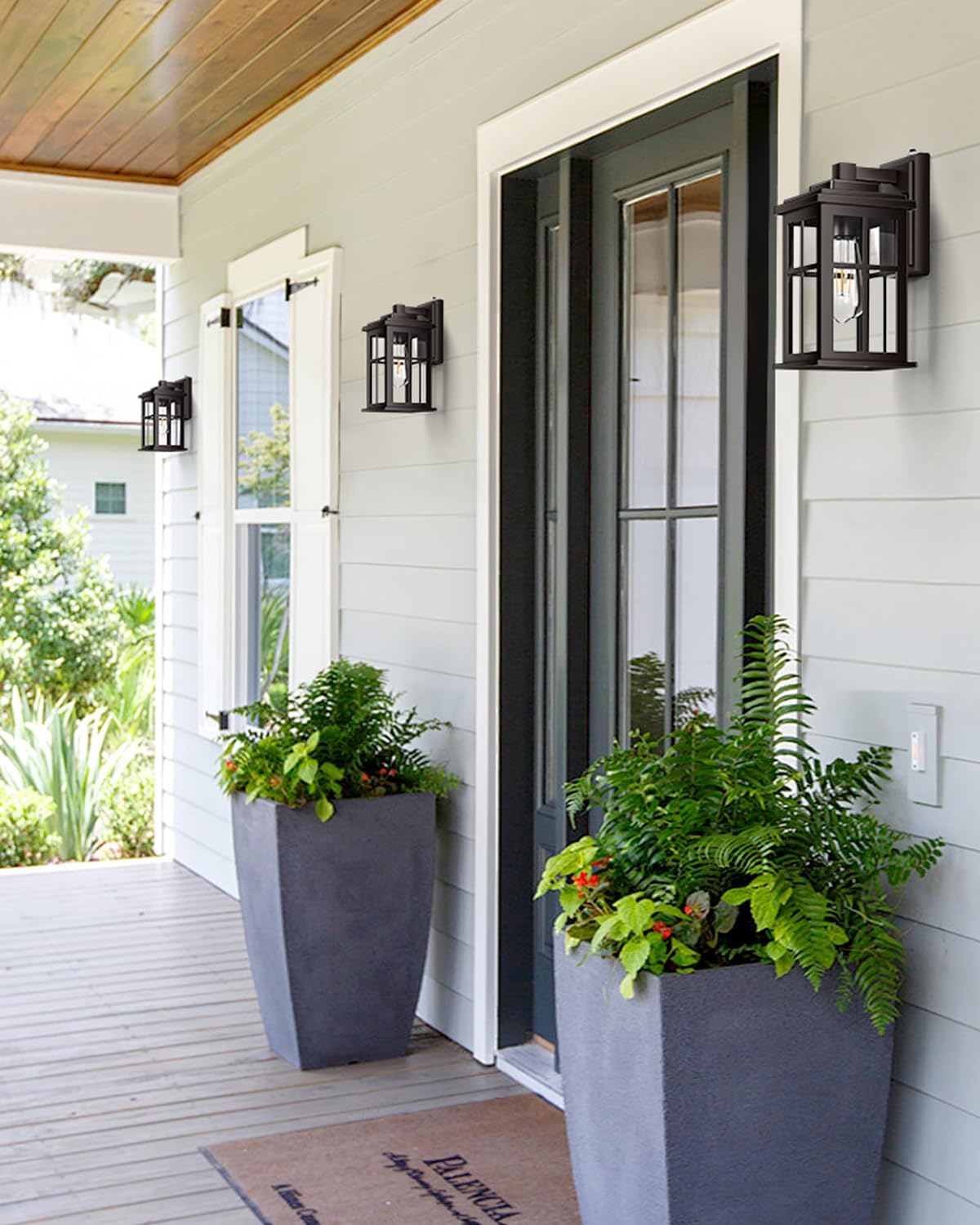 - đăHigh-Quality Construction & Tempered GlassăOur exterior light fixture features a sturdy die-cast Aluminum frame with a bronze finish, ensuring superior craftsmanship. These waterproof, anti-rustic, and weather-resistant wall sconces are built to last. Unlike fragile glass panels, our outdoor wall lights for house are equipped with high-tempered seeded bubble glass that is strong and durable. The seeded bubble glass enhances the light, creating a warm and inviting atmosphere in your house.