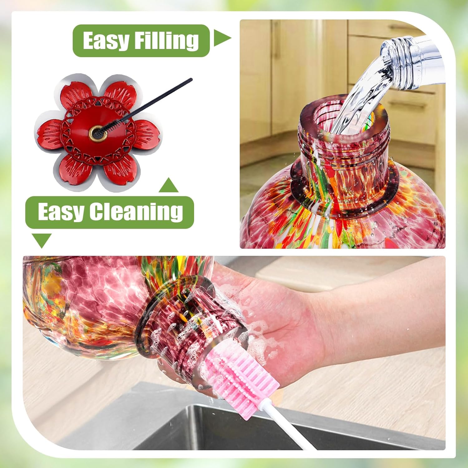 - Easy to Clean and Refill: Simply unscrew the container off the base, cleaning and refilling it will be a cinch. To ensure hummingbird feeder stays clean and well-maintained, we recommend hand washing with warm soapy water