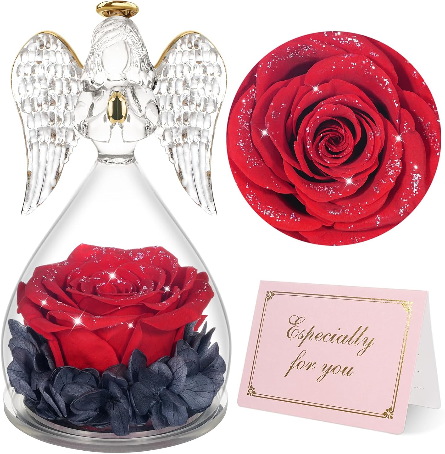 Yamonic Christmas Birthday Gifts for Mom, Angel Figurines with Real Rose Gifts for Her Mom Grandma, Preserved Rose in Glass Angel Figurines for Mothers Day Valentine's Day Gifts for Women (Red Sky)