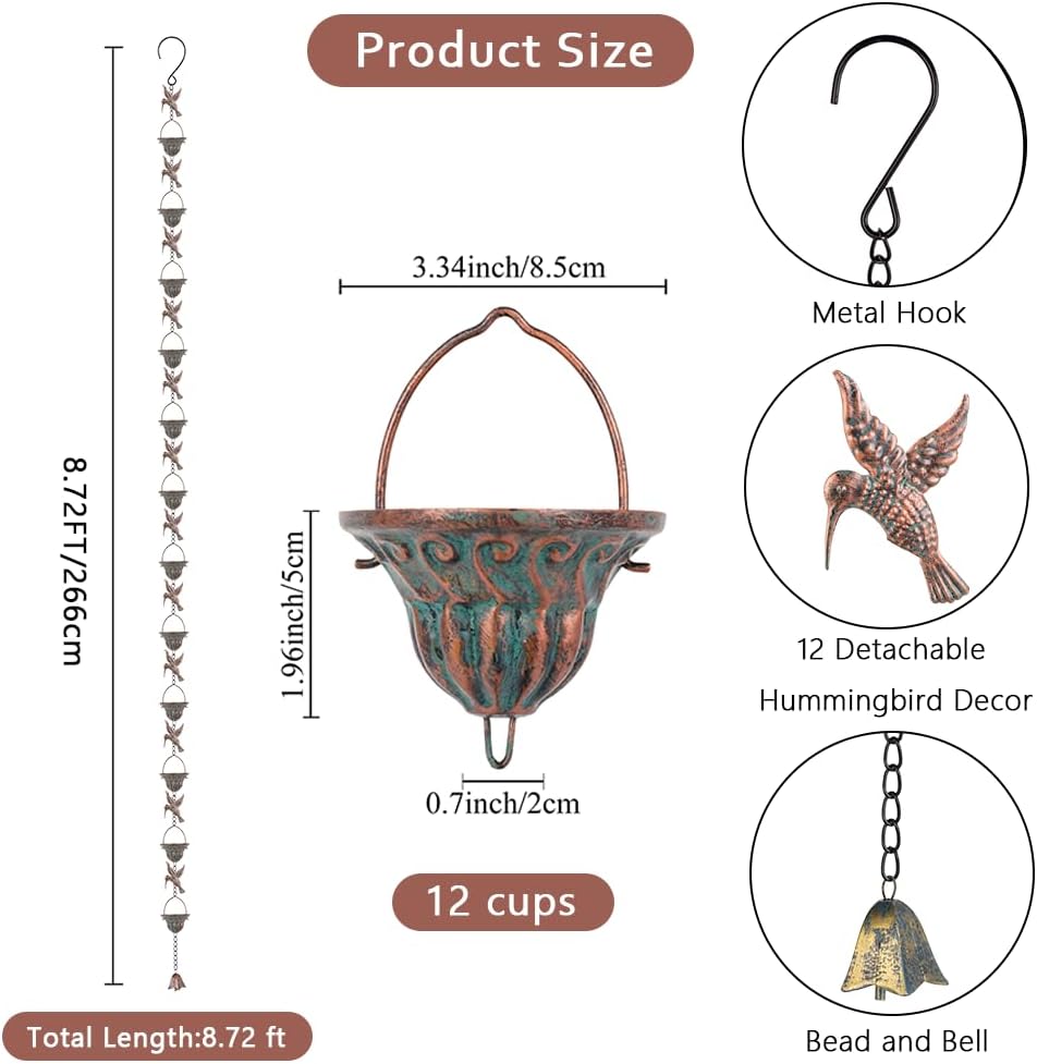 Rain Chain for Gutters, 8.7 Ft Rain Chains with 12 Cups & Detachable Hummingbird Decor, Adjustable Rain Catcher Chain with Bell for Eaves Drainage, Replacement for Downspout