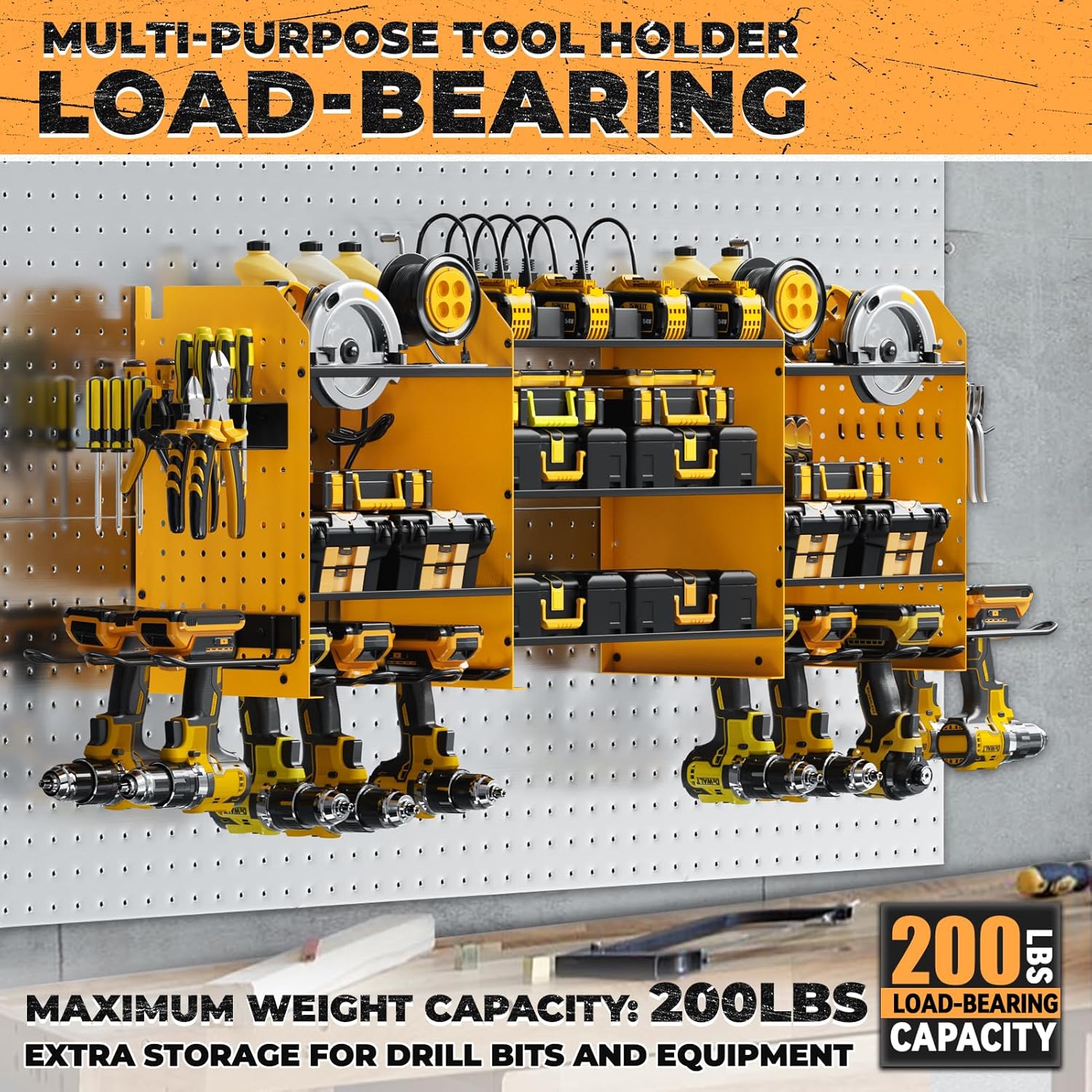 - [High-Capacity Storage]Wall mount power tools organizer features 10 drill holder, alongside a built-in power strip. Its double layer structure keeps rechargeable tools organized in the work area, saving bench space. Notably, the spacing between the middle tiers is significantly larger than typical market offerings.