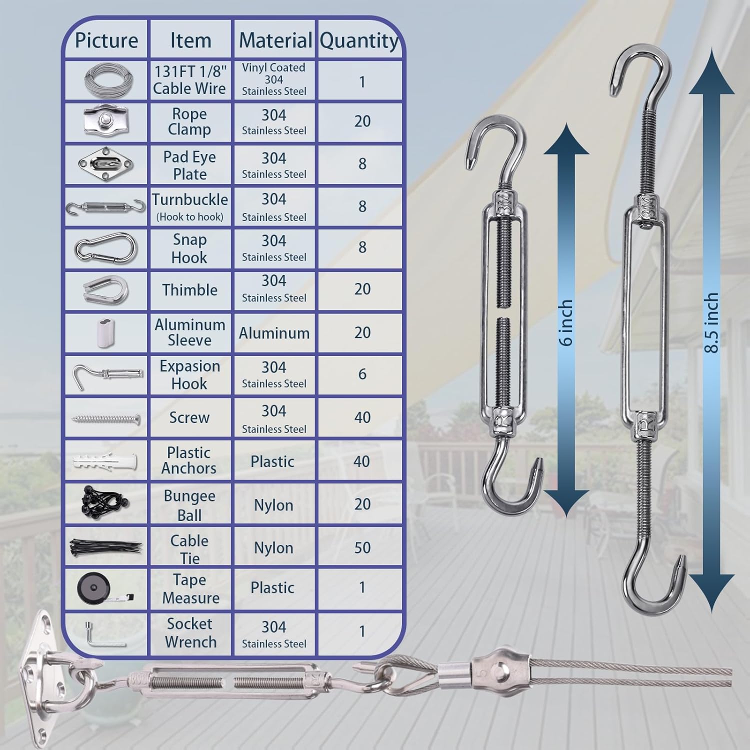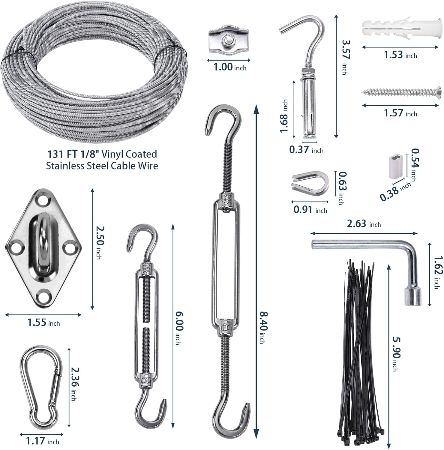 - 【Package Included】:Total 243PCS ,Included 1 x 131FT 1/8" Vinyl Coated Stainless Steel Cable Wire ;8 x M6 Pad Eye ; 8 xM6 Turnbuckle; 8 xM6 Snap Hook ;20 x M5 Rope Clamp ; 20 xM3 thimble ; 20 xM3 aluminum sleeve ; 6 xM6 expansion hooks; ; 40 xScrew; 40 xplastic anchors;20 xBungee ball;50 xNyln cable Ties;1 xSocket wrench;1 xTape Measure .