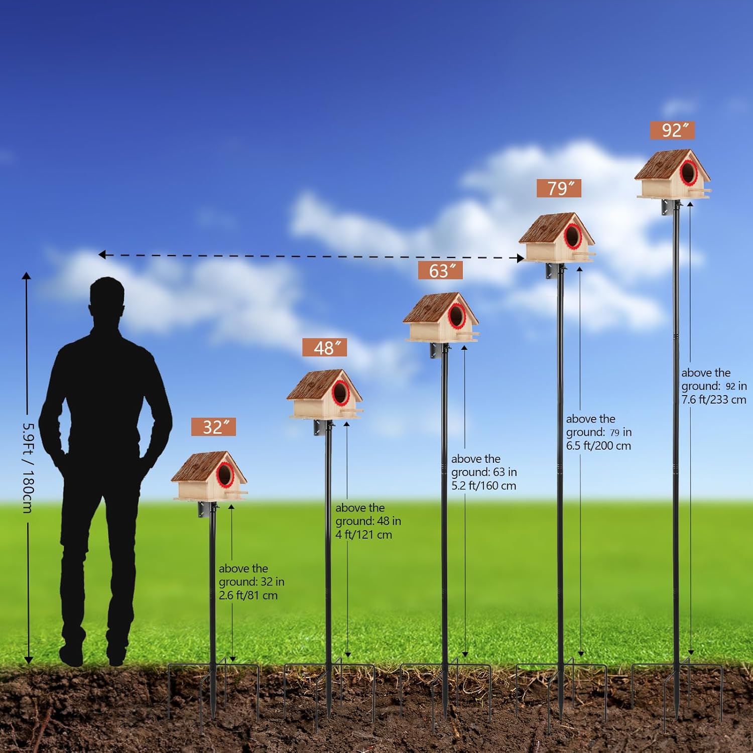 - 【Tailored Height】 Our Bird House Pole stands at 92 inches tall, comprising a 10-inch 5-pronged base and 5 pole sections, each measuring approximately 16 inches. Customize the height to suit your preferences and the habits of various bird species.