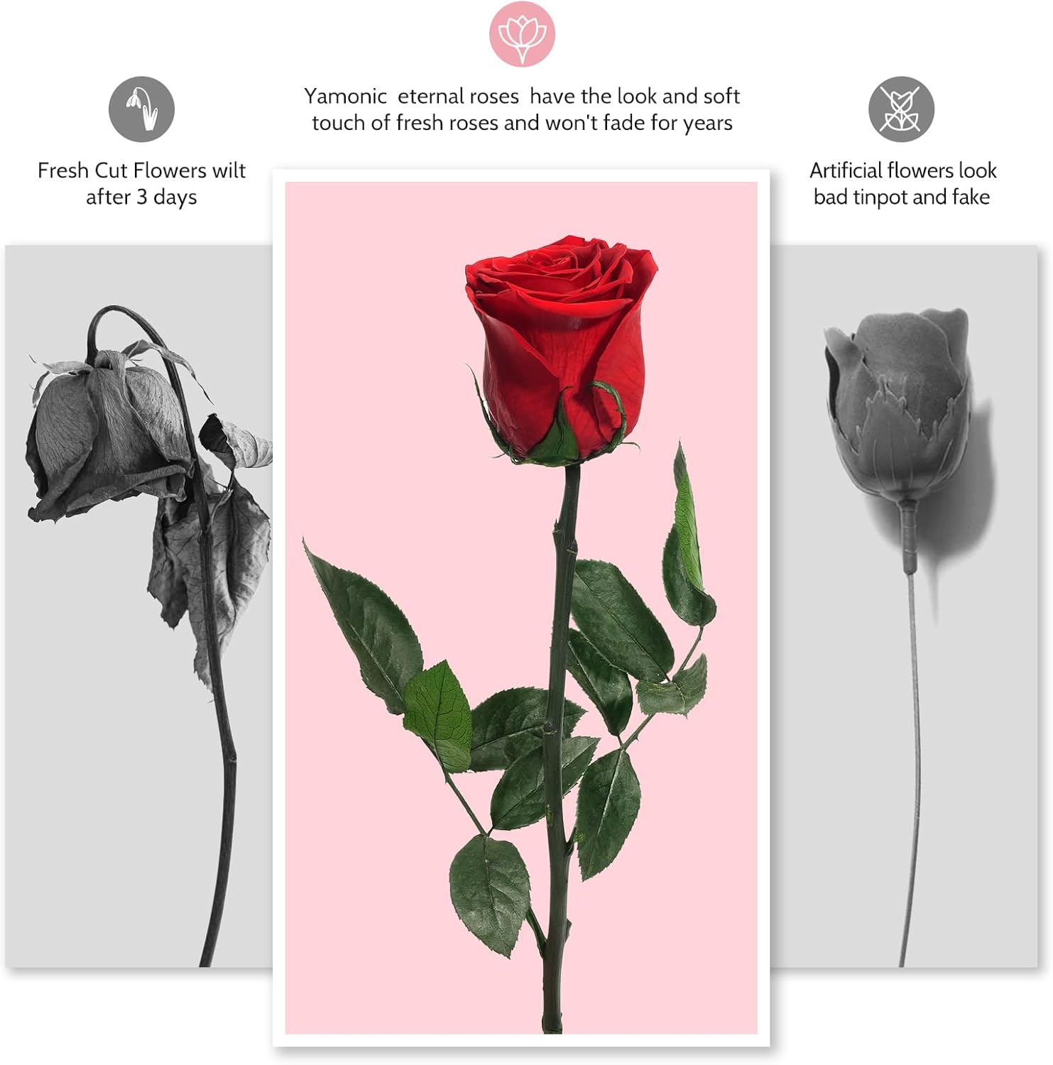 - Superior Quality Real Roses: Yamonic preserved flower rose are made from authentic real roses, handmade and preserved by a special process that retains the look and soft tactile feel of natural roses. They are pollen and fragrance free and will not fade