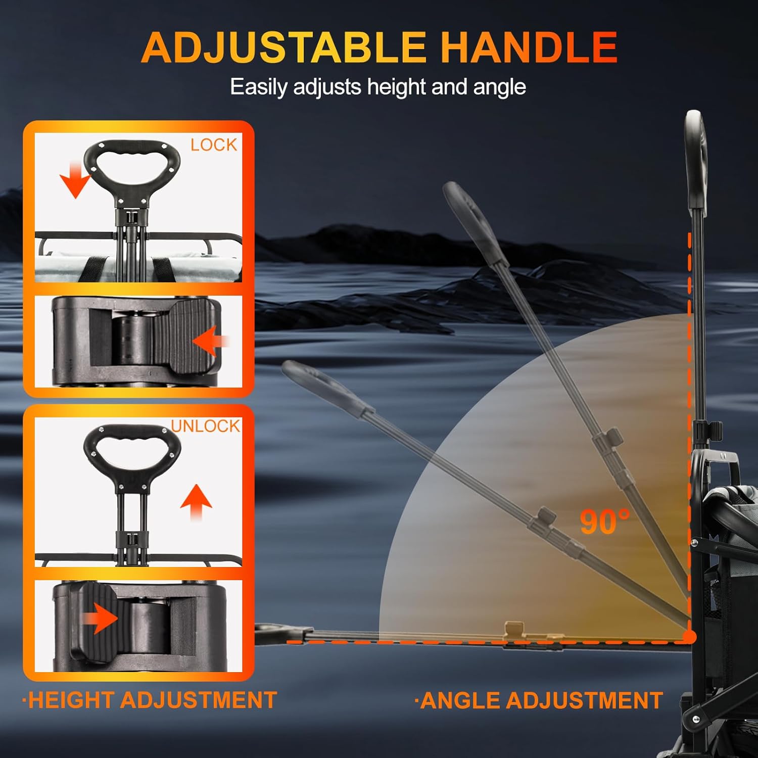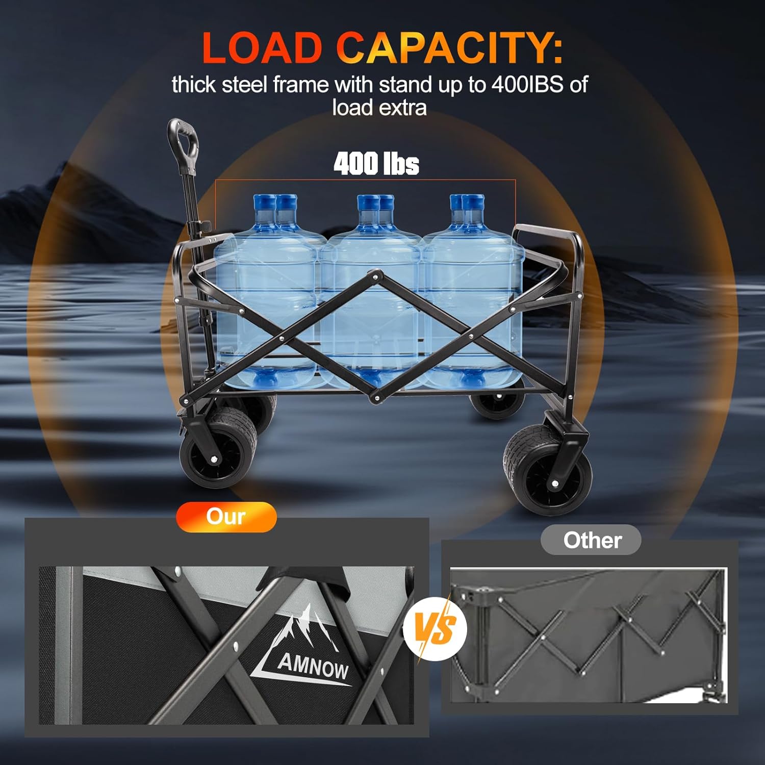 - All-terrain wheels & brake:AMNOW beach wagon have 7.9" diameter big all-terrain wheels suitable for all terrain ground, a good helper for your picnic and camping,Our wagon cart has a brake design on the front wheel, and you can easily control it even on slopes
