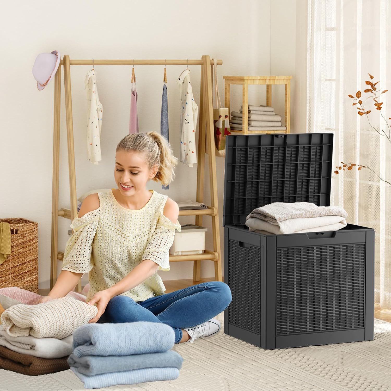 - VERSATILE IN EVERY SETTING: This patio storage box doubles as an indoor laundry organizer and an outdoor yard storage unit for cushions, garden tools, pool accessories, outdoor gear, and more, offering ample space. It can also serve as a side table, patio seat, storage bench, or footstool