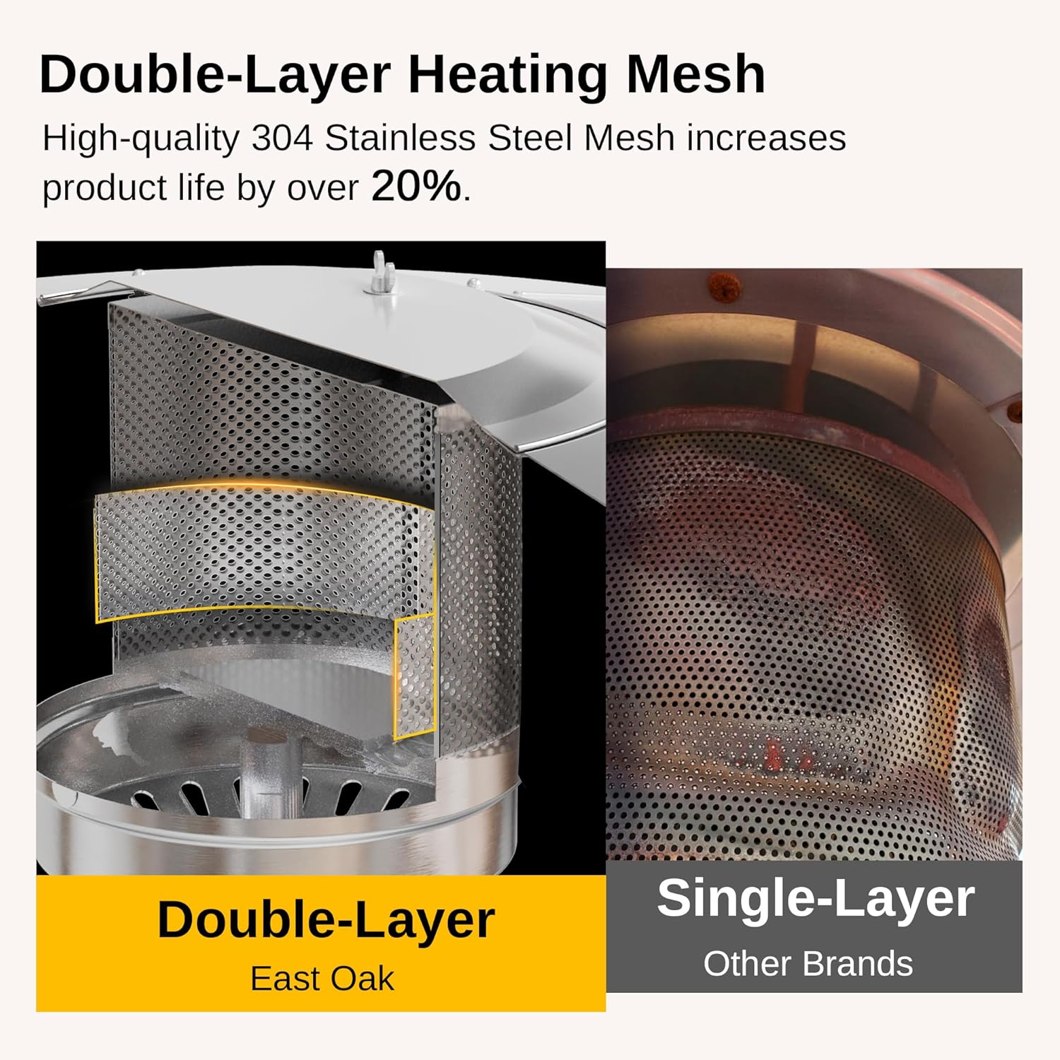 - ๐ ๐ผ๐ฟ๐ฒ ๐๐๐ฟ๐ฎ๐ฏ๐น๐ฒ ๐๐ผ๐๐ฏ๐น๐ฒ-L๐ฎ๐๐ฒ๐ฟ ๐๐ฒ๐ฎ๐๐ถ๐ป๐ด ๐ ๐ฒ๐๐ต: High-quality 304 stainless steel is engineered into our double-cover heating mesh design. Compared with a traditional single-layer burning mesh heater, the EAST OAK Outdoor Heater is more powerful, durable, and safer. All these improvements deliver a 30% longer product life