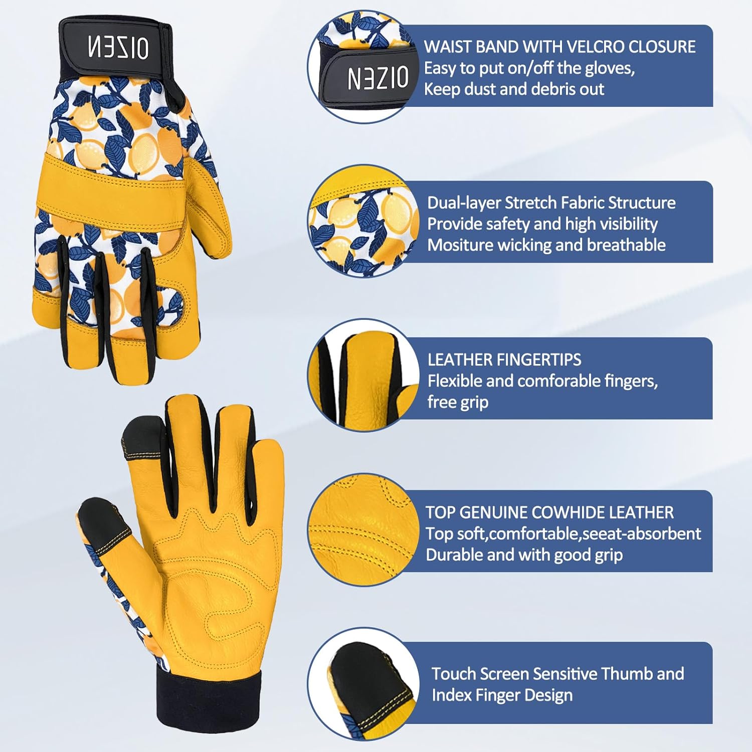 - Ergonomics Design: Stretchable double-layer spandex back keep your hands flexible, breathable & comfortable on the job. Cowhide leather with foam padded palm and reinforced fingertips increase durability. Supportive adjustable with hook & loop strips closure cuff for snug secure fit.