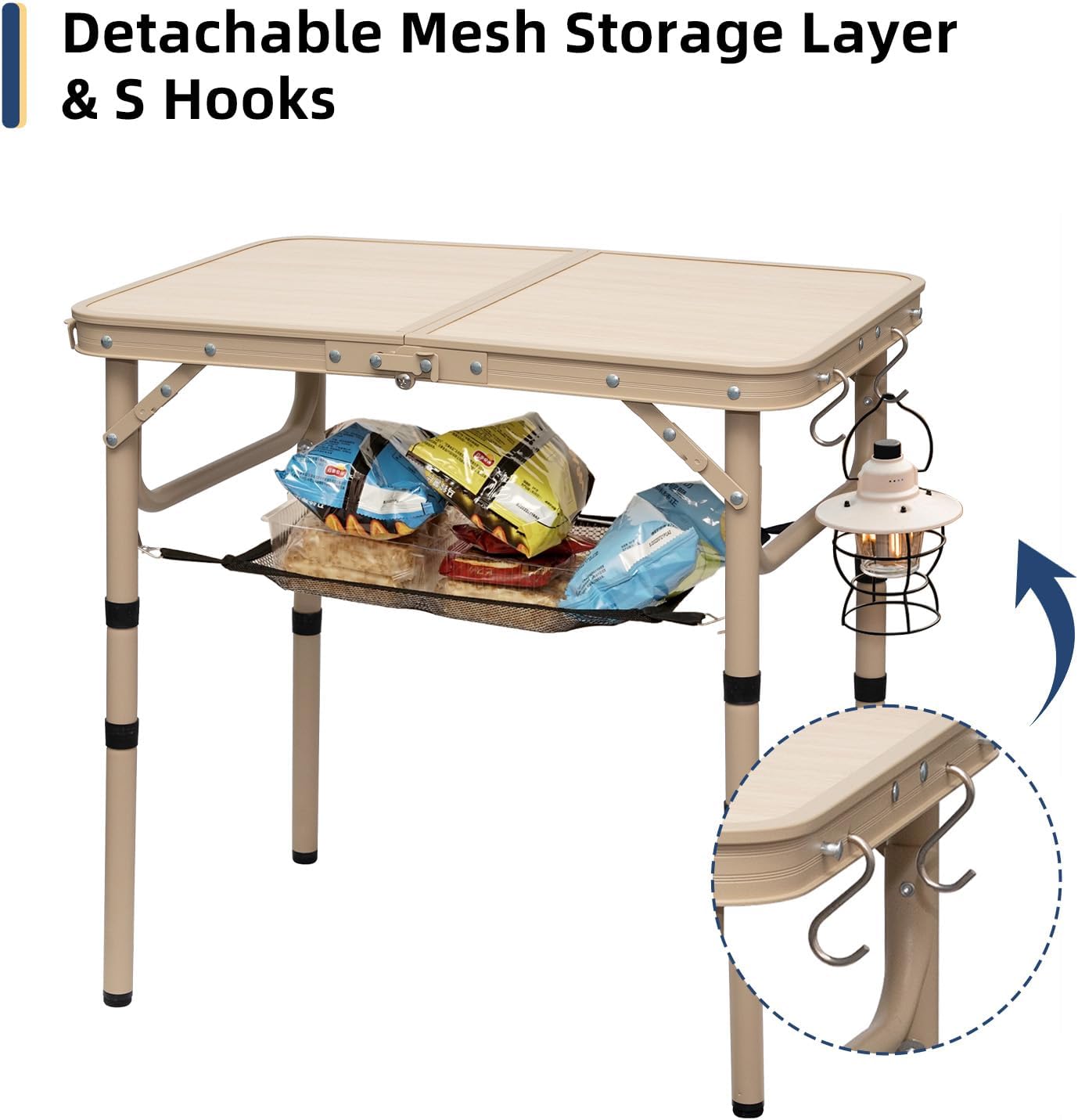 - Extra Storage Space: The portable camping table with mesh storage tier and S hooks provides more space. When camping, you can put some small kitchen tools, snacks, flashlights on the mesh tier. The S hooks can to be hanged speakers, equipment,etc