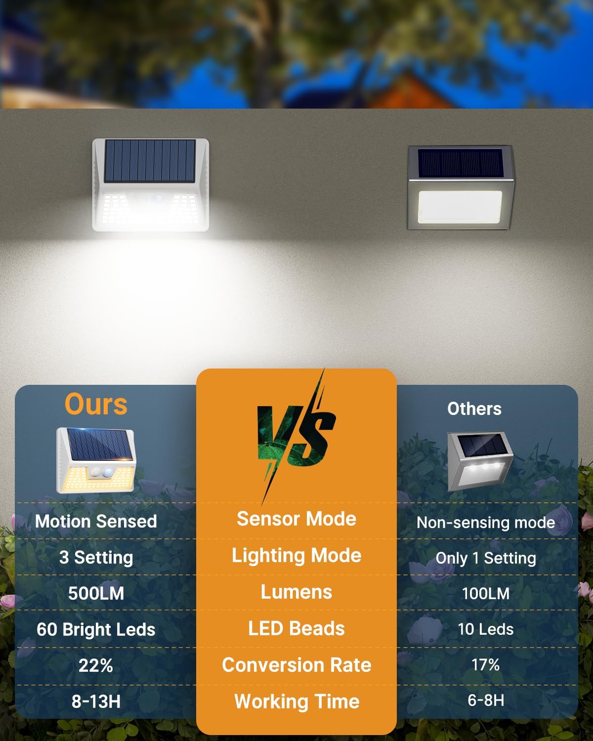 - 【Faster Charging-Longer Illumination】:This solar motion activated light boasts a supercharged solar panel with a 20-22% conversion rate, meaning it charges up quicker during the day. That translates to longer illumination at night, keeping your outdoor space brightly lit for enhanced safety and security