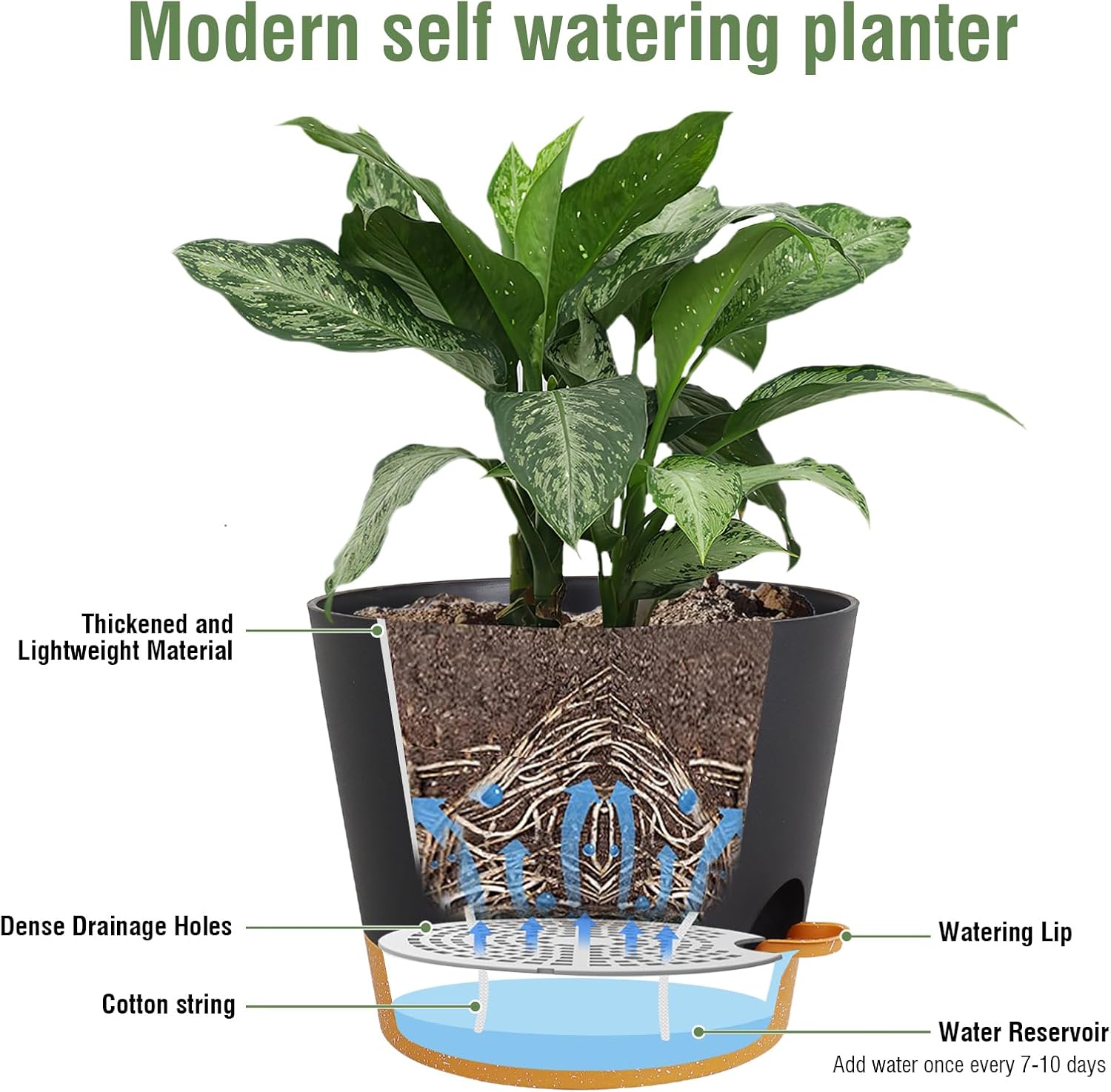 - 【Self-Watering Design】 Self-watering pots is includes a water reservoir at the bottom of the planter. This flower pots automatically supplies water to your plants as needed by a cotton rope, reducing the frequency of watering and ensuring your plants never go thirsty. The reservoir design also helps maintain a consistent moisture level, fostering optimal growth conditions.