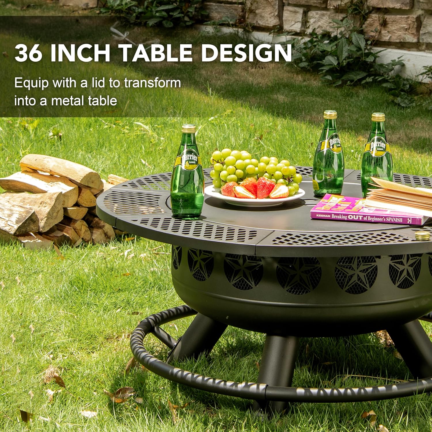 - Specification Of Fire Pit: This wooding burning fire pit measures 36β Dia x 26β H,and the cooking grate with an 18.5-inch diameter grill area, is safe to cook on it.The fire bowl is 24 inch,can hold about 10 pounds to burn. Equipped with a 24 inch lid, it transforms into a 36 inch metal table.