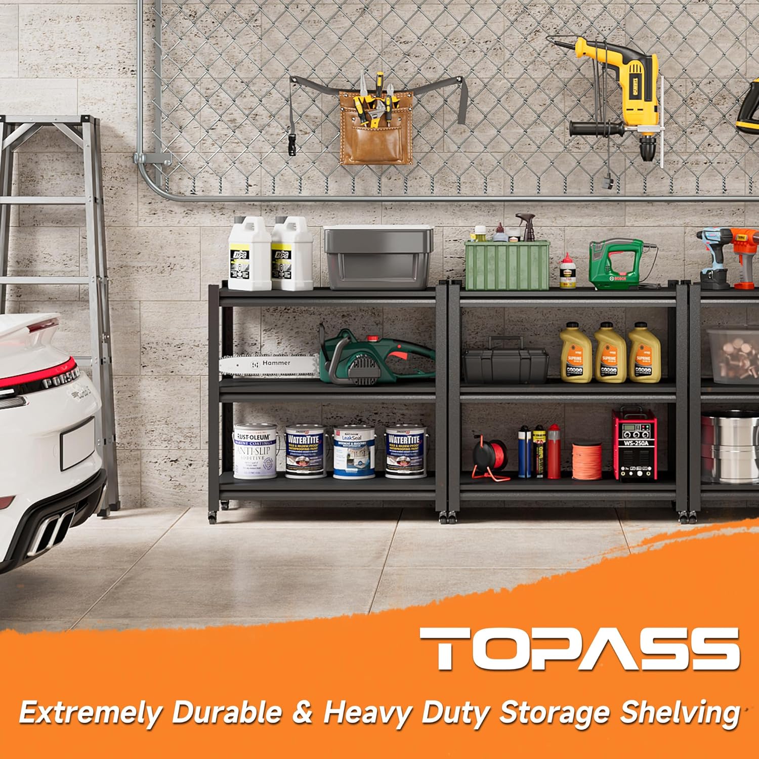 - 【Metal Garage Workbench】 TOPASS Upgrade Workbench are made of quality steel, composed of double layers 2.2mm thick leg supporting, make the heavy duty shelving much more steadily and durable than other metal garage shelves, and also contain 100lbs weight capacity per shelf.