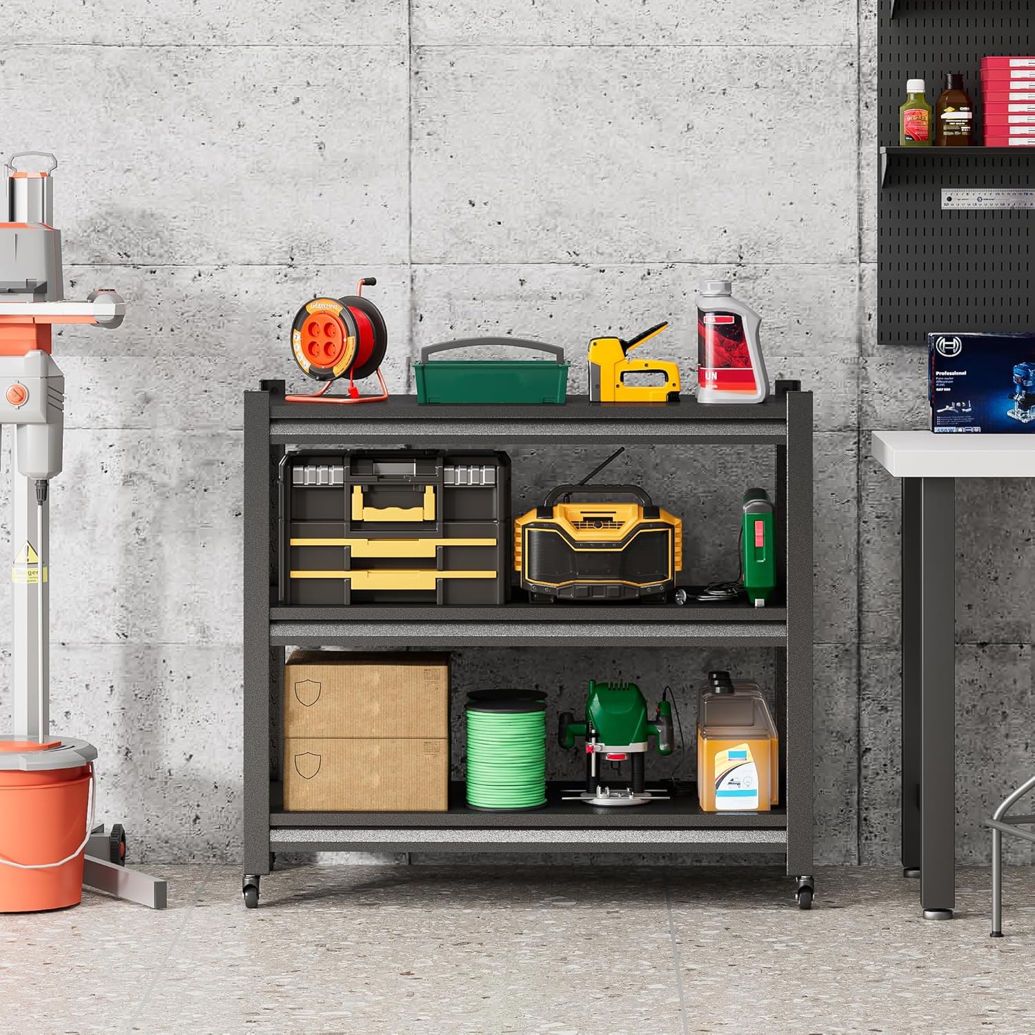 - 【Anti-Rust & Multi-Function】Optimized and upgraded metal workbench features 3-tier dividers. You can customize the shelf layout and use your imagination to customize your space. This workbench offers flexibility with its upgraded metal wheels. With four lockable wheels, effortlessly roll it around both indoor and outdoor spaces.