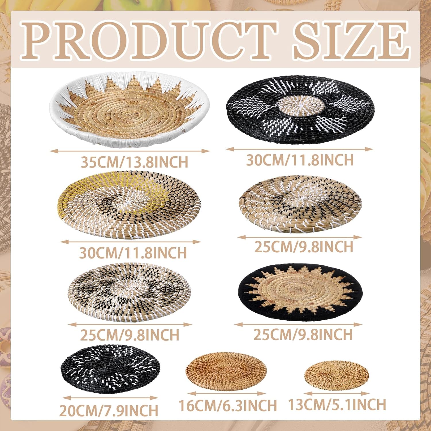 - Enough Quantity and Various Size: you will receive 11 pieces of boho wall baskets in diverse designs and sizes, stylish and classic, enough to cater to your daily uses and matching needs, and can be shared with your friends or family