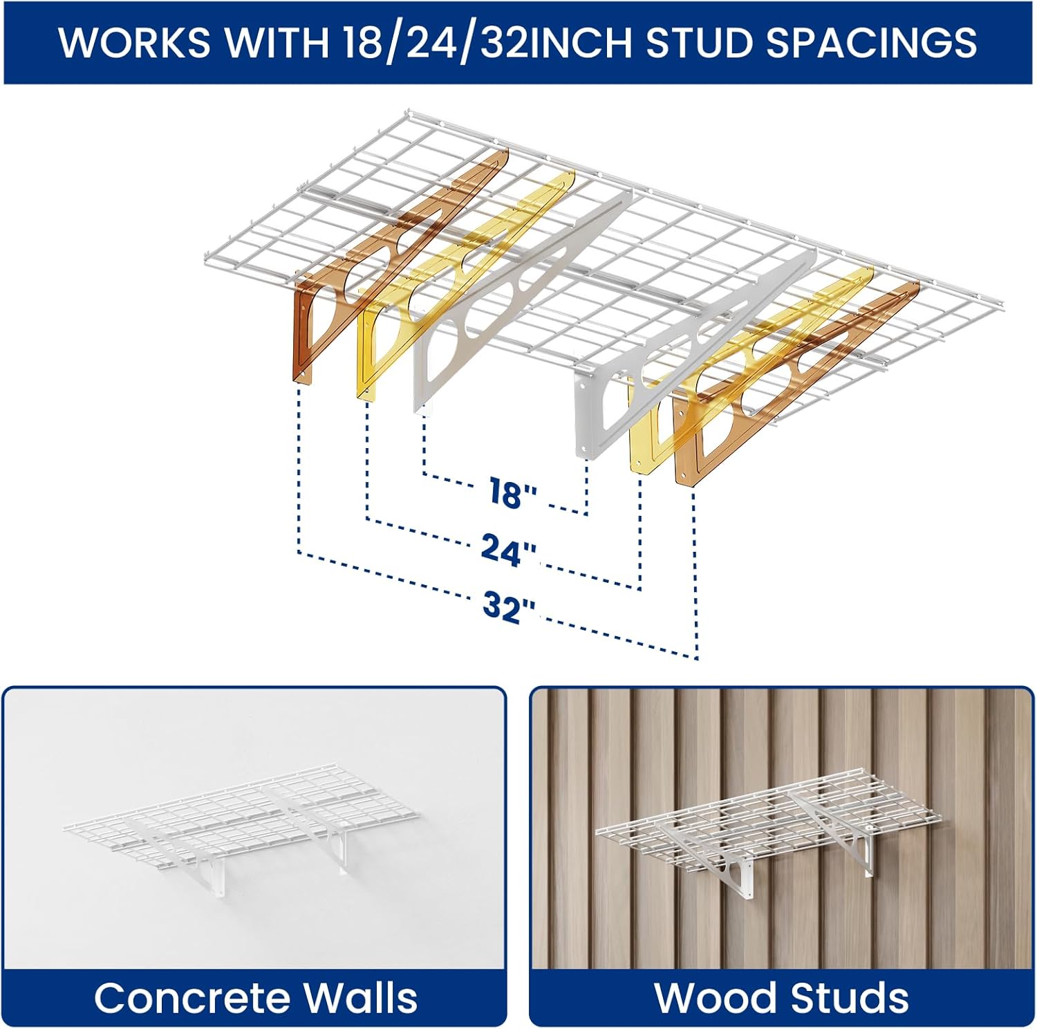 - Can NOT be mounted to metal wall. Suitable for wood studs/joists and concrete wall. Suitable for wood stud spacing of 18", 24" or 32" .