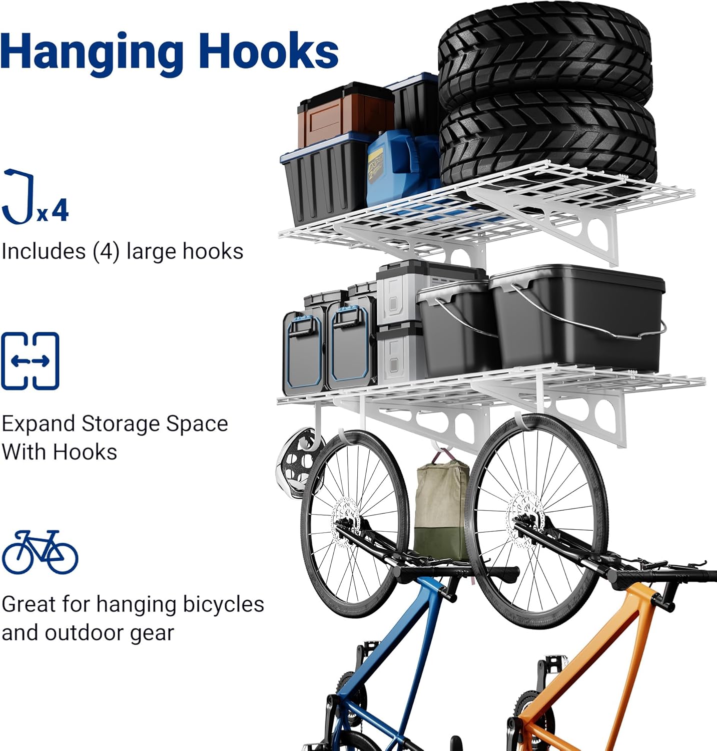 - High Load Capacity: The shelving can safely hold a total load of 400 lbs (200 lbs per tier). Each hook can safely hold 50 lbs.