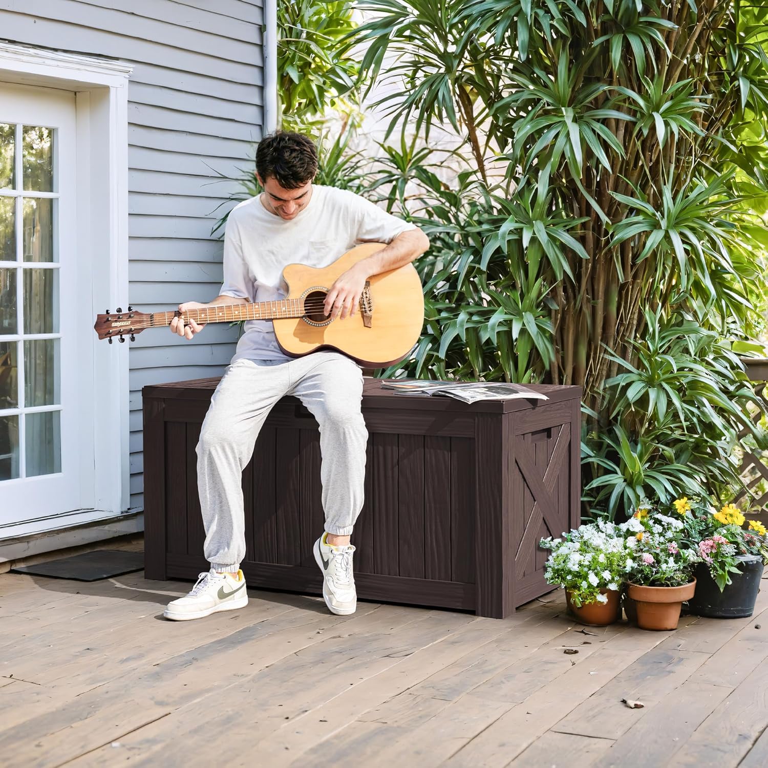 - Good Appearance: There is clear wood grain on the surface of the deck box, which makes it more decorative. Ancient and rustic appearance ensures that it can be a good part of your garden, patio or swimming pool.