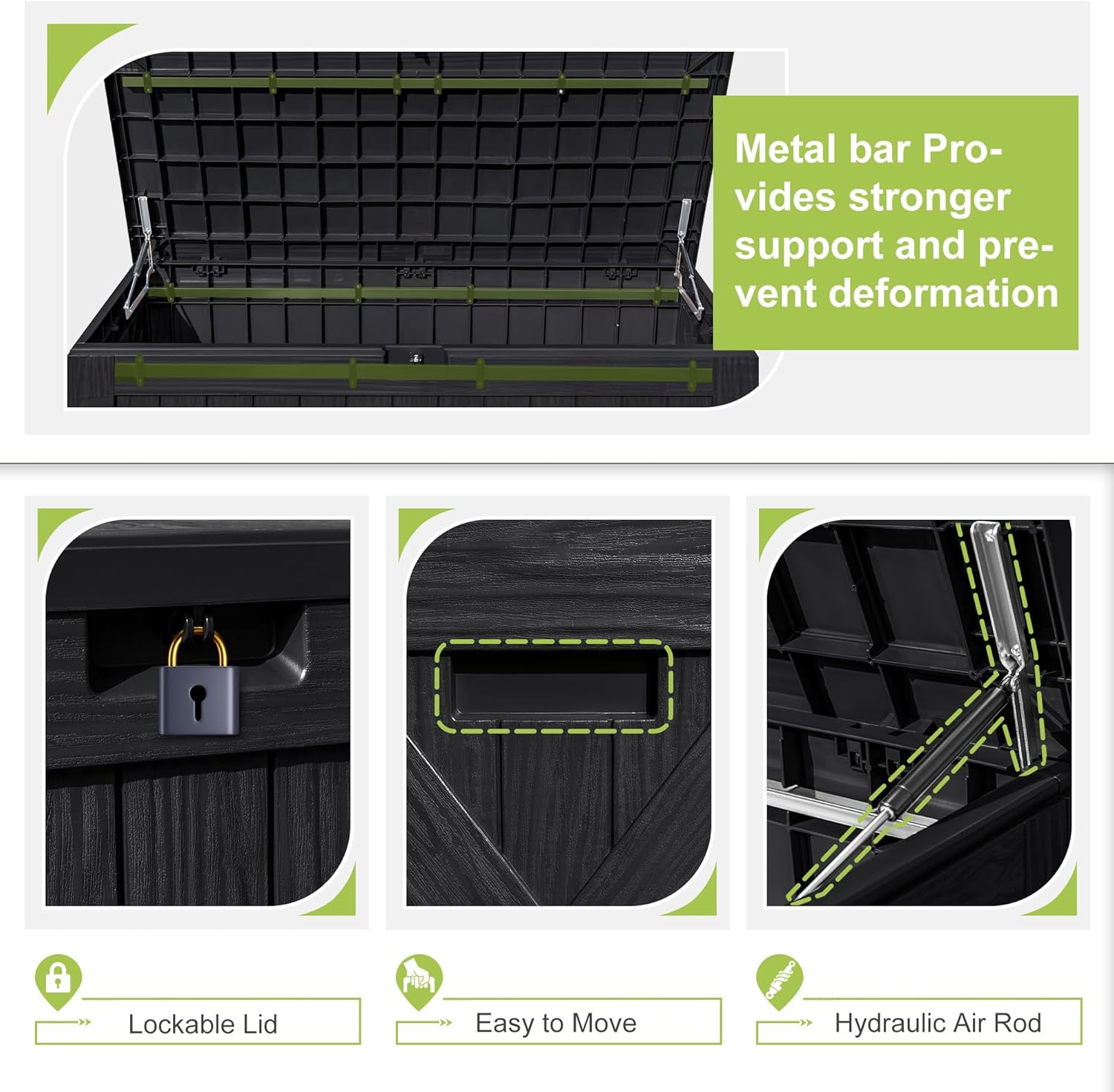 - User-friendly: Thereβre easy-to-move side handles, whitch provide great convenience for you to move the box . And it is also equipped with a hydraulic air rod to prevent you from injury when opening and closing the box, and it can help to support the lid without your hand while picking up or placing your tools or cushions.