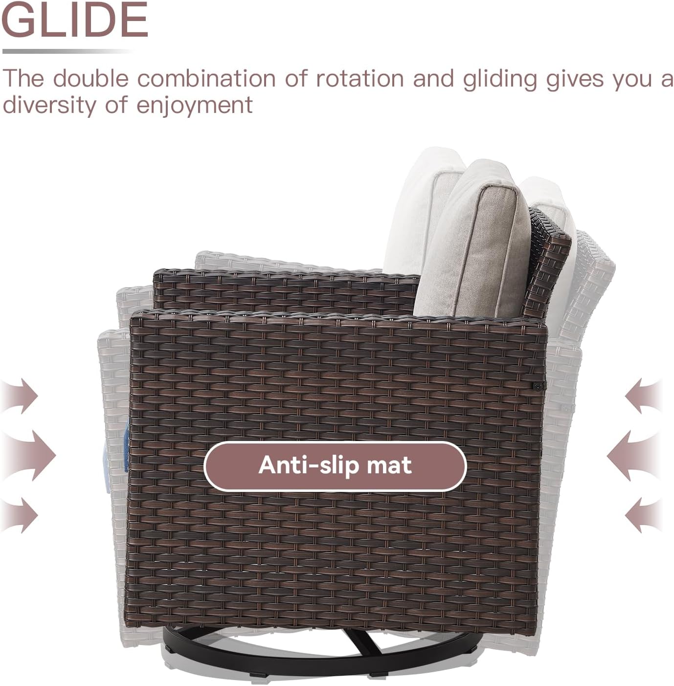 - 360ยฐSwivel Glider Chairs: Design of rotating 360 degree,swinging back and forth,You can easily turn your face away from the sun without moving the entire chair, or swing your seat like a cradle for the ultimate relaxation while listening to music or watching your children play outside.